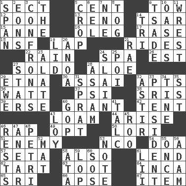 ACROSS 1. Religious group 5. Penny 9. Pull behind 12. "Silly old bear" 13. Western Nevada city 14. Russian ruler of old 15. Queen of England 1702-14 16. Cassini of fashion 17. To erase 18. Overdraft (abbr.) 19. Infant locale 21. Amusement-park features 22. Precipitation 24. Health resort 26. Eastern Standard Time (abbr.) 27. Twentieth part of a lira 28. _ vera 29. Inactive volcano in Sicily 30. Slender Brazilian palm 32. Flats, for short 36. Electrical Unit 37. Air pressure measure (abbr.) 38. Indian titles of respect 39. Celtic language 40. Let have 42. Portable shelter 43. Rich soil 44. Originate 46. Hit sharply and swiftly 49. Elect 50. Australian parrot (variant) 51. Foe 53. Non-commissioned officer (abbr.) 54. ___ good deed 57. Stalk of a moss capsule 58. In addition 61. Grant temporary use of 62. Small pie 63. A blast of a horn 64. South American Indian 65. Indian title of respect (Mr.) 66. Domed church section 67. Detail DOWN 1. Connect, as a bridge 2. Immeasurably long periods of time 3. Meets 4. Definite Article 5. Riding implement 6. Snakelike fish 7. Compass dir. 8. Coat; cloak 9. Sadhe (variant) 10. Fertile tracts in a desert 11. Obtain by seizing forcibly or violently 14. Three (prefix) 19. Flaplike covering 20. Small Philippine buffalo 21. Actress Charlotte 23. Having winglike extensions 24. Killed 25. Luau course 27. Play the lead 28. Indian state 29. She-sheep 31. Small fatty European fish 32. Moving about 33. Elected leader of a country 34. Prong on a fork 35. Fast jet (abbr.) 40. Grand Old Party 41. Baby powder 43. Myrna of the movies 45. Friend of Pooh 46. Musical pauses 47. Approach 48. _ dish (used to culture cells) 52. Floor protector 53. Observe 55. Single time 56. First of billions? 58. "One Day ___ Time" 59. Trim (branches) 60. Distress signal 61. Cards in a Roman deck?