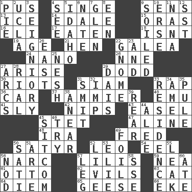 ACROSS 1. Purulenc 4. Scorch 9. Elected reps. 13. Frozen water 14. Peak District village in England 15. Mouths or openings 16. Biblical high priest 17. Ingested 18. Is not 19. Grow older 21. Layer 22. An organ shaped like a helmet 24. Billionth: prefix 26. Compass dir. 27. Originate 29. Texas town _ City 30. Disturbances 31. Thailand, formerly 33. Hit sharply and swiftly 36. Automobile 37. More overdramatic by comparison 40. Australian flightless bird 41. Mischievous 42. Cuts off 43. Artist's stand 45. Proofreading order 47. Place in a line 48. Retirement account (abbr.) 49. Flintstone 50. Letch 52. Lion 54. Snakelike fish 56. Drug cop 57. Ms. Damita and namesakes 59. Teachers' org. 61. "Beetle Bailey" pooch 62. Vices 63. Feline 64. South Vietnam president (1954) 65. Honkers 66. Supplement with great effort DOWN 1. Sliced dessert 2. Southern CA. univ. 3. Signiory (variant) 4. Observe 5. Potato state 6. Nathan's nickname 7. Small, secluded valley 8. Car or cant ending 9. Dirtied 10. Celtic language 11. Nanny 12. Fast jet (abbr.) 20. Compass direction 22. Dwarf 23. Also 25. Tender 27. Arches 28. Monetary unit of Yemen 29. Raised platform 31. Stricken, poetically 32. Naughty child 33. Home 34. So be it 35. Whine 38. Approach 39. Tail end 44. Toward shelter 45. "Cheers" or "Ellen" 46. Attempt 49. Fencing necessities 50. Suttee (variant) 51. Johnson of "Laugh-In" 52. Moving, as bait 53. Writer Wiesel 55. Path through which fluid escapes 56. Allow head to fall sleepily 57. Part of a journey 58. Compass dir. 60. Had dinner