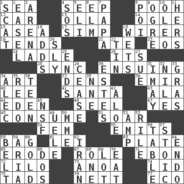 ACROSS 1. Ocean 4. Ooze 8. "Silly old bear" 12. Automobile 13. Spanish pot 14. Stare 15. At sea 17. Simple or foolish person 18. One who wires 19. Looks after 21. Had dinner 23. Greek goddess of the dawn 24. Dipping utensil 26. ___ a Wonderful Life 28. Synchronize (abbr.) 30. Taking place subsequently 34. Nonscientific branch of learning 37. Cub Scout units 39. Independent ruler or chieftain 40. Area sheltered from the wind 41. Before Barbara or Clara 43. Insect wing 44. Genesis locale 46. Stitch closed the eyes of (a falcon) 47. It is so 48. Eat 51. Fly high 54. Opposite of masc. 55. Sends forth 58. Paper or plastic container 61. Luau accessory 63. Food holder 65. Eat (away) 67. Hero or heavy, e.g. 71. Inky black, to poets 72. _ and Stitch 73. Small Philippine buffalo 74. Hat (slang) 75. Small boys 76. Remaining after all deductions 77. Environmental prefix DOWN 1. Scram! 2. Artist's stand 3. Sports stadium 4. Mayday 5. Biblical high priest 6. Shade tree 7. Dad 8. Luau course 9. Legendary monster 10. Margarine 11. Possessive pronoun 16. Sums up 18. Soaks 20. Mischievous 22. Metal container 25. Extremities 27. Institute legal proceedings 29. Stop 30. _____ Park, CO 31. "If ____ say so..." 32. The longest river in the world 33. Pate de foie ____ 34. Actor Baldwin 35. Make new 36. Adolescent 38. Compass dir. 42. _ vera 45. Overdraft (abbr.) 49. Ubangi River tributary 50. Madame (abbr.) 52. Electrical Unit 53. Cause heat under the collar 56. Eating place 57. Unemotional 58. Waist strap 59. Operatic vocal solo 60. Gilded 62. SW Asia republic 64. Inside; within (prefix) 66. Two (Sp.) 68. Single 69. Car dealer's back yard 70. Consume