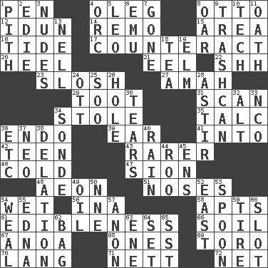 ACROSS 1. Writing instrument 4. Cassini of fashion 8. "Beetle Bailey" pooch 12. Goddess of spring and wife of Bragi 14. San ____ (Riviera town) 15. Type of rug 16. Event that recurs at intervals 17. Act in opposition 20. The bottom of a shoe or boot 21. Snakelike fish 22. Quiet! 23. Splash clumsily 27. Wet nurse 29. A blast of a horn 31. Glance over 34. Fur scarf 35. Baby powder 36. Inside; within (prefix) 39. Hearing organ 41. To the inside or interior of 42. Adolescent 43. Less widely known 46. Having a low temperature 47. The Jewish people; Israel 48. A really long time 51. Olfactory organs 54. Soggy 56. _ tizzy (2 wds.) 58. Flats, for short 61. The property of being fit to eat 66. Land 67. Small Philippine buffalo 68. Singles 69. "Corrida" creature 70. Austrian-born American filmmaker Fritz 71. Remaining after all deductions 72. Fish or hair follower DOWN 1. Heart or essence 2. Singer Brickell 3. Unadorned figures 4. The grampus (Milton) 5. Lion 6. Australian flightless bird 7. Went 8. Rowing implement 9. File 13 10. Technology 11. Pledge 13. 1994 drama film starring Jodie Foster 18. Afternoon social gathering 19. Shade tree 24. Baseball player Mel 25. "Barney Miller" actor Jack 26. Hollow 28. Being in motion 30. Pulls into pieces 32. Keyboard modifier key 33. Non-commissioned officer (abbr.) 34. Message 36. And so on (abbr.) 37. Modern: prefix 38. Conveyance 40. Precipitation 44. Friend of Pooh 45. Followers of ems 49. Petroleum 50. Compass dir. 52. 90 degrees 53. Soup utensil 54. Welt 55. Pulitzer Prize-winning author Ferber 57. Soon (poet.) 59. Hoop that covers a wheel 60. Narrow opening 62. Paper or plastic container 63. Compass dir. 64. Arrange properly for use 65. Fast jet (abbr.)
