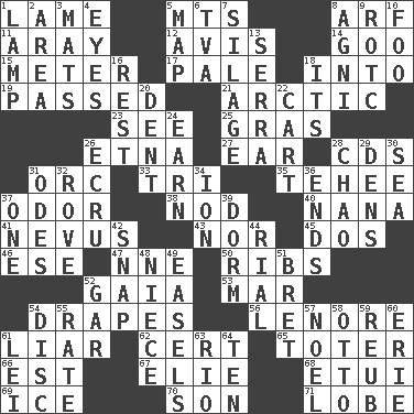 ACROSS 1. Unable to walk 5. Mountains (abbr.) 8. Sandy's bark 11. Like ___ of sunshine 12. Deliberation 14. Thick or sticky substance 15. Distance measurement 17. Diluted with white 18. To the inside or interior of 19. Went by 21. Northern region 23. Perceive with the eye 25. Pate de foie ____ 26. Inactive volcano in Sicily 27. Hearing organ 28. Music discs 31. The grampus (Milton) 33. Three (prefix) 35. Giggle 37. Aroma 38. Allow head to fall sleepily 40. Nanny 41. Congenital growth or mark on the skin 43. And not 45. Two (Sp.) 46. Compass dir. 47. Compass dir. 50. Teases 52. Greek goddess of the earth (variant) 53. Spoil 54. Window treatments 56. Poe poem 61. One who doesn't tell the truth 62. An absolute certainty 65. Carrier 66. Eastern Standard Time (abbr.) 67. Writer Wiesel 68. Needle case 69. Frozen water 70. Male offspring 71. Ear part DOWN 1. Desk light 2. Type of rug 3. Floor coverings 4. Sight organs 5. Atlas unit 6. Federal power corp. 7. Fodder prepared in a silo 8. Hindu god of fire 9. College mil. group 10. Egg _ yung 13. Father Junipero _ 16. Relief 18. It is 20. Gouge 22. Draw slowly or heavily 24. Merit 26. Shade of tan 28. US Secretary of Labor Elaine L. _ 29. Hiding places for outlaws 30. Ocean 31. Lyric poems 32. Be footloose 34. Electrically charged atom 36. Conclusions 37. Single 39. Dormintory (informal) 42. Fastener 44. Monetary unit of Yemen 48. Sibling's daughter 49. Artist's stands 51. Cy Young winner Saberhagen 52. Slender fish 54. Compact _ 55. Pace 57. Christmas carol 58. Von Bismarck 59. Reuben's nickname 60. One of the Great Lakes 61. Luau accessory 63. _ de Janeiro 64. Nine, plus one