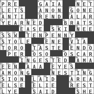 ACROSS 1. Before (prefix) 4. Greek goddess of the earth (variant) 8. Fish or hair follower 11. Allows 13. At once, immediately (arch.) 14. Went 15. Against 16. Tear apart 17. Having or resembling wings 18. Had a strong desire 21. Naughty children 22. Relaxation 23. What Jean-Claude Killy likes to do 25. Born 26. Compass dir. 29. 3-inch nail 32. Took without asking 34. Compass dir. 35. By way of 38. "Corrida" creature 39. Clothes sense 41. Inside; within (prefix) 43. For each 44. Bear (Spanish) 45. Motion picture award 46. Swallowed 50. Housemaid (var.) 51. Car or cant ending 54. Auto club (abbr.) 55. Sight organs 57. Amid 59. Snuggling 63. The Jewish people; Israel 64. Put down 67. Length times width 68. Otherwise 69. Writer Wiesel 70. Take ten 71. Potassium hydroxide 72. Stated 73. A female animal or person DOWN 1. Romp 2. French philosopher Descartes 3. Singer James 4. Place where plants grow 5. A saturated hydrocarbon 6. Electrically charged atom 7. Also 8. Pitcher Ryan 9. Maternal 10. Laconic 12. Beget 14. Slender fish 19. Nathan's nickname 20. Compass dir. 21. Storage container 23. Posted 24. Leg joint 26. Fast jet (abbr.) 27. Obstruct or block passage 28. Had on 30. Mexican monetary units 31. Jacques Cousteau's middle name 33. Australian parrot (variant) 36. South American Indian 37. First of billions? 39. Ancient Roman robe 40. Toward the sea 42. Mouth or opening 45. Lyric poems 47. Tired old horse 48. Looked after 49. Sight organ 51. Artist's stand 52. Poet Dickinson 53. Trap for birds or small mammals 56. Play the lead 58. Compass dir. 60. Angers 61. Tender 62. Yard entry 64. French article 65. According to 66. One more than two