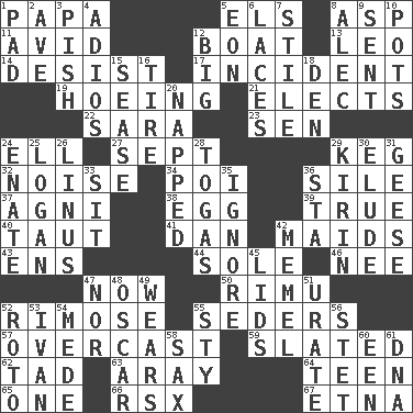 ACROSS 1. Dad 5. Raised railways 8. Viper 11. Enthusiastic 12. Water vessel 13. Lion 14. Stop 17. Event 19. Weeding 21. Chooses 22. "Two Mules for Sister ____" 23. Elected rep. 24. Pipe bend 27. Back-to-school mo. 29. Cask 32. Annoying sound 34. Luau course 36. Filth; sediment 37. Hindu god of fire 38. Oval reproductive body of a fowl 39. Loyal 40. Pulled tight 41. Daniel's nick name 42. Unmarried girls 43. Followers of ems 44. Not divided or shared with others 46. Born 47. Immediately 50. Tall New Zealand timber tree 52. Full of chinks, cracks, or crevices 55. Spring feasts 57. Cloudy 59. Scheduled 62. Small boy 63. Like ___ of sunshine 64. Adolescent 65. Single 66. Acura sports coupe 67. Inactive volcano in Sicily DOWN 1. Groovy apt. 2. "___ Maria" 3. Expression of disdain 4. Goodbye (Sp.) 5. Period of immesurable duration 6. Shoestrings 7. Vertical member of a panel or frame 8. Actor Baldwin 9. Transmitted 10. Plant holders 12. Massive 15. Gospel singer Marvin 16. Hoop that covers a wheel 18. Lair 20. Slept 24. Related on the mother's side 25. Utah city north of Ogden 26. "_ and Lucy" (Charlie Brown theme song) 28. Ancient Roman robes 29. Japanese brewing company 30. Dodge 31. Honkers 33. Be seated 35. Disregard 36. R.R. building 42. Klaipeda city 45. Flaplike coverings 47. Or not 48. Witty Wilde 49. Erodes 51. A salt of uric acid 52. Printing process, for short 53. "Terrible" tsar 54. Ancient Persian 55. Filthy place 56. Proofreading order 58. Saxophone 60. Car or cant ending 61. Heredity factor (abbr.)