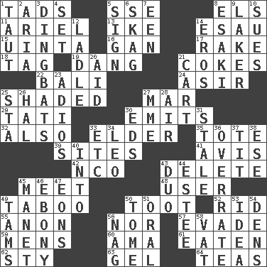 ACROSS 1. Small boys 5. Compass dir. 8. Raised railways 11. Satellite of Uranus 13. Eisenhower's nickname 14. Son of Isaac 15. National forest in Provo, Utah 16. Separate the seeds from cotton 17. Immoral or dissolute person 18. Label 19. Mild oath, euphamism for damn 21. Popular sodas 22. Indonesian resort city 24. SW Saudi Arabia district 25. Cast a shadow over 27. Spoil 29. Jacques of French films 30. Gives off 32. In addition 33. A person who is older than you are 35. Carry 39. Settings 41. Deliberation 42. Non-commissioned officer (abbr.) 43. Keyboard key 45. Rendezvous 48. One who makes use of a thing 49. Off limits 50. A blast of a horn 52. To free from 55. At once, immediately (arch.) 56. And not 57. Elude 59. Not women's 60. Housemaid (var.) 61. Consumed 62. Filthy place 63. Set 64. Afternoon social gatherings DOWN 1. Strained 2. Operatic vocal solo 3. Empty-headed or silly people 4. Put into a specified state 5. Signal 6. Heroin 7. Car or cant ending 8. 1973 Nobel Price Winner (Physics) Leo 9. Member of a famous L.A. basketball team 10. Takes to court 12. Dipping utensil 14. Greek god of love 20. Help 21. Heavy open wagon 23. Goodbye (Sp.) 25. R.R. building 26. Actor Linden 27. Madame (abbr.) 28. Wind 30. Begley and Asner 31. Showing deterioration from age 33. And so on (abbr.) 34. Lion 36. Make much ado about nothing 37. Teat (slang) 38. Compass dir. 40. To the inside or interior of 43. Superhero pair 44. First name in cosmetics 45. French painter Edouard 46. Black 47. Immeasurably long periods of time 49. Scottish caps 50. Heavy book 51. Of the mouth 53. The main thing one is thinking about 54. Cub Scout units 56. Tired old horse 58. Large container