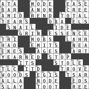ACROSS 1. "One Day ___ Time" 4. Method 8. Comfort 12. Oblong piece of solid material 13. At once, immediately (arch.) 14. Algonquian 15. Among 17. Tear apart 18. "_____ Recall" 19. Lacerates 21. Chief or king in Benin or Nigeria 23. Raised railways 24. Slow-paced one 26. Binary compound 28. Broad smile 30. Core 34. Three (prefix) 37. Disorderly crowds 39. Cowardly lion portrayer 40. Possessed 41. Gives off 43. Teachers' org. 44. Makes supply last 46. Matures 47. Nonscientific branch of learning 48. Had a strong desire 51. Halt 54. ___ a Wonderful Life 55. Took without asking 58. Affectionate concern, for short 61. It would 63. Collection of objects 65. Forest 67. Armor plate that protects the chest 71. Russian ruler of old 72. Silent film actress Nazimova 73. Connecting point 74. Begley and Asner 75. Kill 76. A blast of a horn 77. To separate or throw off DOWN 1. Blind as ____ 2. Corrects by punishment or discipline 3. Believer in; advocate of (suffix) 4. Impair 5. Single 6. Spanish title 7. Inside; within (prefix) 8. Environmental prefix 9. Johnson of "Laugh-In" 10. Lick closed 11. Snakelike fish 16. To trail on the ground 18. Small boys 20. Title for a knight 22. Again 25. Welles in "The Third Man" 27. Snakelike fish 29. Roamer 30. _____ Park, CO 31. Nanny 32. "Mermaids" star 33. Part of Q.E.F. 34. Those people 35. Libertine 36. The content of cognition 38. Massive 42. Fast planes 45. _ Lanka 49. Nuclear Threat Initiatives 50. Eastern Standard Time (abbr.) 52. Baseball player Mel 53. Left side of a ship or aircraft 56. Failure 57. Dodge 58. It was, poetically 59. Hang loosely or laxly 60. Root beer relative 62. Scratch 64. Celtic language 66. 24 hours 68. Thick or sticky substance 69. Wedding promise 70. Put into a specified state
