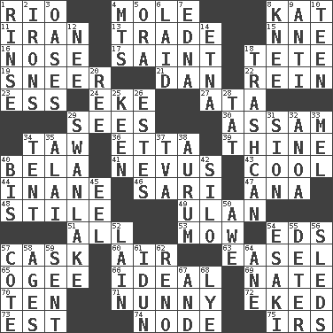 ACROSS 1. River (Sp.) 4. Undercover agent 8. Krazy ___ of comics 11. SW Asia republic 13. Barter 15. Compass dir. 16. Characteristic smell of wine 17. Virtuous person 18. False hair 19. Contemptuous expression 21. Daniel's nick name 22. It's straight from the horse's mouth 23. Curvy letter 24. Supplement with great effort 27. "One Day ___ Time" 29. Observes 30. Indian state 34. The 23rd letter of the Hebrew alphabet 36. Singer James 39. One or ones belonging to thee 40. Actor Lugosi 41. Congenital growth or mark on the skin 43. Calm and collected 44. Empty; void 46. Indian skirt 47. Santa ___, CA 48. Vertical member of a panel or frame 49. ____ Bator, Mongolia 51. 100% 53. Cut the grass 54. Begley and Asner 57. Keg 60. Atmosphere 63. Artist's stand 65. Double curve, resembling the letter S 66. Perfect 69. Nathan's nickname 70. Nine, plus one 71. Pet term 72. Made supply last 73. Eastern Standard Time (abbr.) 74. Thickened enlargement 75. Big collection agency DOWN 1. Wash lightly 2. Metal shackles 3. Fertile tracts in a desert 4. Mountains (abbr.) 5. Mouth or opening 6. Put down 7. Pulitzer Prize-winning author Ferber 8. Leg joint 9. Opposed to 10. Adolescent 12. Born 14. Inactive volcano in Sicily 18. File 13 20. To sift 25. Peachy ____! 26. _____ Park, CO 28. Make lace 29. Tchaikovsky ballet 31. The Jewish people; Israel 32. Small Philippine buffalo 33. Cartoonist voice _ Blanc 34. Portable shelter 35. Mountain range southwest of Kyrgyzstan 37. Federal power corp. 38. Gold (Symbol: Au) 40. Altar cloth linen 42. Grain storage tower 45. Snakelike fish 50. Deep reverence 52. (Had) reclined 54. 1973 Nobel Price Winner (Physics) Leo 55. Prevent from occurring 56. Bobsleighs 57. ____ d'Azur (French Riviera) 58. Ripens 59. Transmitted 61. Goddess of spring and wife of Bragi 62. Former U.S. Attorney General Janet 64. A saturated hydrocarbon 67. Added to 68. Sodium hydroxide