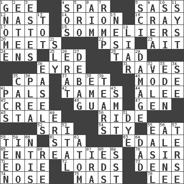 ACROSS 1. Unit of force equal to gravity 4. Practice fight 8. Backtalk 12. Political cartoonist Thomas 14. Greek mythologigal hunter 16. Supercomputer manufacturer 17. "Beetle Bailey" pooch 18. Wine waiters 20. Confronts 22. Air pressure measure (abbr.) 23. Small island 24. Followers of ems 25. Directed 28. Small boy 30. Jane of fiction 31. All-night dance parties 35. Numbers guy (abbr.) 37. Collude with 40. Method 41. Friends 42. Makes less strong or intense 44. Toward shelter 45. Algonquian 46. Island territory of the United States 47. Commissioned mil. rank 48. Lacking originality or spontaneity 50. Travel on or in a vehicle 52. _ Lanka 54. Filthy place 55. Ingest 58. Shallow baking pan 61. R.R. building 63. Peak District village in England 65. Pleas 70. SW Saudi Arabia district 71. Singer Brickell 72. Domineers 73. Lairs 74. Sense of smell 75. Vertical spar for supporting sails 76. Area sheltered from the wind DOWN 1. Dwarf 2. Eroded 3. _____ Park, CO 4. Distress signal 5. Adept person 6. Direct toward a target or goal 7. Play 8. _-fi 9. Type of rug 10. Indian skirt 11. System (abbr.) 13. Small child 15. Egg locale 19. One who doesn't tell the truth 21. Roguish 26. Part of Q.E.F. 27. Debunk (Brit. slang) 29. Break 30. Artist's stands 32. Grand slam 33. Genesis locale 34. Perceive with the eye 35. Heavy open wagon 36. Entreaty 38. Australian flightless bird 39. Lacerates 41. Personal Computers (abbr.) 43. Stricken, poetically 49. Celtic language 51. Color 53. Slanted text style (abbr.) 55. Artist's stand 56. Place in a line 57. Laconic 58. Adolescent 59. Southeast Asian peninsula 60. Nuclear Threat Initiatives 62. Tiny particle 64. June honoree 66. Portuguese money of account (variant) 67. Retirement account (abbr.) 68. Begley and Asner 69. Fast jet (abbr.)