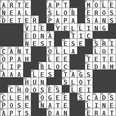 ACROSS 1. Johnson of "Laugh-In" 5. Fitting 8. Undercover agent 12. Actress Patricia 13. Messy guy 15. Greek god of love 16. Prevent from occurring 18. Dad 19. Without 20. Compete 22. Crying or shouting loudly 24. Pulitzer Prize-winning author Ferber 26. Nervous spasm 27. A home for chicks 28. Compass dir. 29. Indian title of respect (Mr.) 32. Patter 35. Water jar 37. Car dealer's back yard 38. Brightly colored fish 39. Area sheltered from the wind 40. Wig 41. Mouth edge 42. Coalition 43. Dutch treat 44. American Automobile Association (abbr.) 45. French article 46. Labels 49. Attila the _ 50. Narrow, elongated depression 51. Opts 55. Luau accessory 56. To starve (Brit.) 57. Double curve, resembling the letter S 59. Oodles 63. Introduce or present, as a question 64. Nathan's nickname 65. Actor's bit 66. Tenement units (abbr.) 67. Daniel's nick name 68. Part of Q.E.F. DOWN 1. Plus 2. To riddle 3. Make lace 4. Veterans Day date 5. Viper 6. Romp 7. Drink excessively 8. Mesonic 9. Northwest Algerian city 10. Having great length 11. Curvy letter 14. Greek mezzo-soprano Agnes 17. Travel on or in a vehicle 21. Followers of ems 23. Whopper 25. Ringlike coral islands and reefs 28. Opts 29. Downhill vehicle 30. Roll call or roster of names 31. A whole individual unit 32. Root beer relative 33. Capital of Western Samoa 34. California wine valley 36. Lion 40. A testis 42. Gillaume's butler role 45. Nilotic language 47. Everything 48. Leaves 49. Dwellings 51. Hoof sound 52. Command 53. Mild oath 54. Stalk of a moss capsule 56. Tax preparer (abbr.) 58. Car or cant ending 60. Wind 61. Heredity factor (abbr.) 62. Arrange properly for use