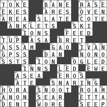ACROSS 1. Casino tip 5. Object of repulsion 9. Raze (variant) 13. Makes supply last 14. Ancient Greek god of war 15. Baking chamber 16. Type of rug 17. Chalkboard 18. ____ d'Azur (French Riviera) 19. Short socks 21. What Jean-Claude Killy likes to do 22. Charged atoms 23. Nourish 24. Uncastrated adult male sheep 27. White ___ sheet 28. Cy Young winner Saberhagen 29. Indian state 31. E Mali city 32. _ the terrible 36. Global Positioning Systems (abbr.) 37. Daniel's nick name 38. Words to Nanette 39. Fast planes 40. Electrically charged atom 41. Stared 42. Taverns 44. Directed 46. She-sheep 47. Toward the sea 48. Greek god of love 50. Had dinner 51. Catching in a trap 54. Israeli folk dance 56. Snob 58. Wander 60. Soon (poet.) 61. Wither 62. Singer James 63. Incision 64. Had on 65. Ooze DOWN 1. Afternoon social gathering 2. Gumbo ingredient 3. Peachy ____! 4. 1973 Nobel Price Winner (Physics) Leo 5. Greek mezzo-soprano Agnes 6. Ancient river in northeast Turkey 7. Fish or hair follower 8. Compass dir. 9. Shooting up abruptly 10. Keep away from 11. Arrange properly for use 12. Compass dir. 17. Elected reps. 20. Rich soil 21. Observe 23. From 24. Labels 25. United States Postal Service (abbr.) 26. Inconspicuous attention getter 28. Prohibit 30. Helper 31. Separate the seeds from cotton 33. Short-tailed, large-bodied rat 34. Afresh 35. Thickened enlargement 37. Two (Sp.) 40. _ tizzy (2 wds.) 41. Scent 43. Born 44. Poe poem 45. Part of Q.E.F. 47. Composer Copland 49. Founders of families 51. Fly high 52. Make mention of 53. Yard entry 54. Possessed 55. Single 56. Compass dir. 57. Modern: prefix 59. Atlas unit