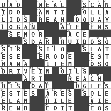 ACROSS 1. June honoree 4. Welt 8. Examine minutely or intensely 12. Wedding promise 13. Opposed to 14. Water jar 15. Hats (slang) 17. 480, 500 or 516 sheets of paper 18. A city in N France, SE of Calais 19. Utah city north of Ogden 21. Had dinner 23. Followers of ems 24. Sir (Sp.) 26. Adept person 28. Neighbor of Neb. 30. Boisterous (Brazilian Portuguese) 34. Title for a knight 37. Grain storage tower 39. Narrow board 40. Compass dir. 41. Eat (away) 43. Eastern Standard Time (abbr.) 44. Grandmother 46. A whole individual unit 47. Bear (Spanish) 48. Popular '50s hangout 51. Lubricates 54. Tate display 55. Arrive at 58. Again 61. Clumsy lout 63. Stares 65. _____ Park, CO 67. Ancient Greek god of war 71. Not divided or shared with others 72. Style 73. Cause heat under the collar 74. Compete 75. Tear apart 76. Prepare for publication 77. Greek goddess of the dawn DOWN 1. Deli pickle 2. Goodbye (Sp.) 3. Evade 4. Armed conflict 5. Compass dir. 6. _ moment's notice (2 wds.) 7. Pale green bean 8. "Barney Miller" actor Jack 9. A slight indication 10. Actor Alda or Thicke 11. Negative votes 16. Without 18. Tenth: prefix 20. Dreamland 22. The 19th letter of the Greek alphabet 25. Raze (variant) 27. Begley and Asner 29. Japanese brewing company 30. Cowboy competition 31. Butter sub 32. Backtalk 33. "Beetle Bailey" pooch 34. Post 35. Austrian river, tributary to the Danube 36. Painter Guido (1575-1642) 38. Car dealer's back yard 42. Arab leader 45. Actress Gardner 49. Greek god of love 50. Call ___ day 52. Lion 53. Settles 56. Garlic unit 57. Sun: prefix 58. Fermented drink made from hops 59. Capri or Wight 60. Comedian Laurel of Laurel & Hardy 62. Conductor's collection 64. Perceives with the eye 66. Conclusion 68. To free from 69. Biblical high priest 70. Arrange properly for use