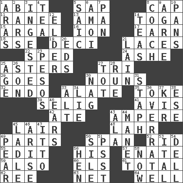 ACROSS 1. "This won't hurt ____!" 5. Plant excrement 8. Head covering 11. The wife of a rajah (variant) 13. Nanny (var.) 14. Ancient Roman robe 15. Therefore, facetiously 16. Electrically charged atom 17. Merit 18. Compass dir. 19. Tenth: prefix 21. Shoestrings 22. Hurried 24. American tennis player Robert 25. Michaelmas daisies 27. Three (prefix) 29. Travels 30. Parts of speech 32. Inside; within (prefix) 33. Having winglike extensions 35. Puff or smoke 39. Former Milwaukee Brewers owner Bud 41. Opinion 42. Had dinner 43. Electrical Unit 45. Den 48. Cowardly lion portrayer 49. Actors' quests 50. Connect, as a bridge 52. To free from 55. Prepare for publication 56. Part of HMS, perhaps 57. Maternal 59. In addition 60. Raised railways 61. Add up to 62. To sift 63. Fish or hair follower 64. Water source DOWN 1. Ancient river in northeast Turkey 2. Drinking establishments 3. Swallowed 4. Afternoon social gathering 5. Ketch in the Levant 6. Mine, in Marseilles 7. Baking dish 8. Team commander 9. Match 10. Baking dishes 12. A person who is older than you are 14. Beverages made from leaves 20. Begley and Asner 21. (Had) reclined 23. Mexican monetary units 25. Grow older 26. Male child 27. Small child 28. Regret 30. Tired old horse 31. Staphylococcus 33. Keyboard modifier key 34. Falsehood 36. Make much ado about nothing 37. Apertif with cassis 38. Compass dir. 40. Hearing organs 43. In the manner of 44. French painter Edouard 45. Dipping utensil 46. Originate 47. "Tell ____ the Marines!" 49. Lightbulb-shaped fruit 50. Filth; sediment 51. Inconspicuous attention getter 53. Slanted text style (abbr.) 54. Small valley 56. Layer 58. At this time