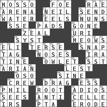ACROSS 1. With motion or animation 6. Enemy 9. Actress Charlotte 12. Sports stadium 13. Famous astronaut Armstrong 14. Post 15. Wetness 16. Snakelike fish 17. Religious women 18. Compass dir. 19. Groovy apts. 20. Went 21. Ardor 23. RI univ. 24. System (abbr.) 25. Catcalls? 28. Biblical high priest 30. Laconic 34. Fastener 35. Label 36. Olfactory organs 38. Retirement account (abbr.) 39. Prong on a fork 41. A small or young owl 43. Fast jet (abbr.) 44. Believer in; advocate of (suffix) 46. For fear that 48. Bear (Spanish) 49. Trig term 50. Group working together 51. To draw with force 53. Curvy letter 56. Silvers or Donahue 57. Carrot, for example 58. Goodbye (Sp.) 60. Observes 61. Against 62. Cell (Danish) 63. Big collection agency 64. Parent Teacher Assoc. 65. Wear away DOWN 1. Informal term for the mouth 2. Mouths or openings 3. Arranges properly for use 4. Dwarf with a sinus problem 5. Boat paddle 6. Nourish 7. Petroleums 8. Raised railways 9. One who advocates reunion 10. Queen of England 1702-14 11. Begley and Asner 13. Be tempered by heat 14. Sounds asleep 19. Eucharist need 20. Chewing product 22. Eastern Standard Time (abbr.) 24. Seigniories (variant) 26. Armed conflicts 27. Petty quarrel 28. Singer James 29. Den 31. Friend of Pooh 32. Compass dir. 33. Snakelike fish 37. Former Milwaukee Brewers owner Bud 40. Artist's stands 42. Nine, plus one 45. Immediately 47. Sowing specialist 49. Suttee (variant) 50. "Mermaids" star 51. Do not 52. Round or rotation of duties 54. Grain storage tower 55. Disposed of to a purchaser 56. 23rd letter of the Greek alphabet 57. Strike 58. Adept person 59. Perceive with the eye