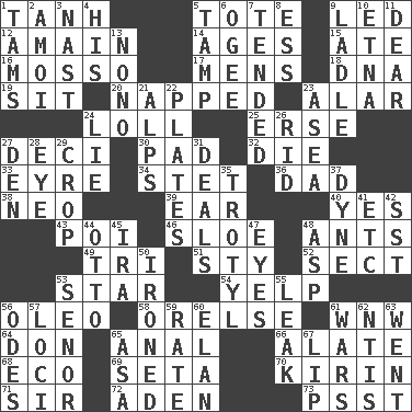 ACROSS 1. Hyperbolic tangent 5. Carry 9. Directed 12. With great haste 14. Ripens 15. Had dinner 16. With motion or animation 17. Not women's 18. Heredity factor (abbr.) 19. Be seated 20. Slept 23. Having or resembling wings 24. Hang loosely or laxly 25. Celtic language 27. Tenth: prefix 30. Groovy apt. 32. Expire 33. Jane of fiction 34. Proofreading order 36. Male parent 38. Modern: prefix 39. Ewer handle 40. It is so 43. Luau course 46. A type of plum 48. Pismires 49. Three (prefix) 51. Filthy place 52. Religious group 53. Play the lead 54. Sharp bark 56. Margarine 58. Threatening words 61. Compass dir. 64. Spanish title 65. Of or related to the anus 66. Having winglike extensions 68. Environmental prefix 69. Bristle 70. Japanese brewing company 71. Title for a knight 72. Arabian gulf 73. Inconspicuous attention getter DOWN 1. Scottish caps 2. Mine, in Marseilles 3. Political cartoonist Thomas 4. Part of HMS, perhaps 5. Pack (down) 6. Double curve, resembling the letter S 7. Watched over 8. Curvy letter 9. Dipping utensil 10. Inactive volcano in Sicily 11. Letter starter 13. Words to Nanette 21. High mountains 22. Food holders 23. At sea 24. Untruth 26. To free from 27. Lair 28. Sight organ 29. Riding implement 31. Allots cards 35. Trinitrotoluene 37. Unit of force 41. And so on (abbr.) 42. Fast jet (abbr.) 44. Von Bismarck 45. Retirement account (abbr.) 47. Sight organs 48. Viper 50. Pressed 53. Sir (Sp.) 55. Path through which fluid escapes 56. Lyric poems 57. Locales 59. Pace 60. Liveliness 61. Armed conflicts 62. Nuclear Threat Initiatives 63. Gone 65. White ___ sheet 67. Mouth edge