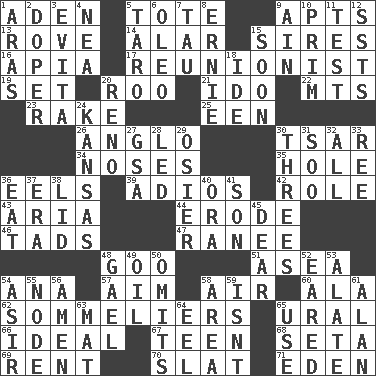 ACROSS 1. An important port of Yemen 5. Haul 9. Flats, for short 13. Be footloose 14. Having or resembling wings 15. Titles for men of rank and authority 16. Capital of Western Samoa 17. One who advocates reunion 19. Arrange properly for use 20. Friend of Pooh 21. Wedding promise 22. Mountains (abbr.) 23. Immoral or dissolute person 25. Car or cant ending 26. White American of non-Hispanic descent 30. Russian ruler of old 34. Olfactory organs 35. Hollow 36. Snakelike fish 39. Goodbye (Sp.) 42. Hero or heavy, e.g. 43. Roberta Peters solo 44. Wear away 46. Small boys 47. The wife of a rajah (variant) 48. Thick or sticky substance 51. At sea 54. Santa ___, CA 57. Direct toward a target or goal 58. Wind 60. Chicken ___ king 62. Wine waiters 65. Mountain range 66. Standard of perfection 67. Adolescent 68. Stalk of a moss capsule 69. Monthly bill 70. Narrow board 71. Paradise DOWN 1. Caspian sea tributary 2. Drug addict 3. Webber/Rice musical 4. Teachers' org. 5. Edible starchy tuberous root 6. Butter sub 7. The 19th letter of the Greek alphabet 8. Bert's buddy 9. The 18th letter of the Arabic alphabet 10. Demure 11. Trial 12. Fast planes 15. Within a short period 18. Binary compound 20. Former U.S. Attorney General Janet 24. Sunflower state 27. Girls' org. (abbr.) 28. Directed 29. Flexible twig of a willow tree 30. Triplets 31. "Barney Miller" actor Jack 32. Everything 33. To riddle 36. Erode 37. Period 38. Hat (slang) 40. Mouth or opening 41. Male child 45. Letter starter 48. Highlander 49. Lubricate 50. Leaves out 52. Having ears or earlike features 53. Having winglike extensions 54. SW Saudi Arabia district 55. Connecting point 56. So be it 58. Length times width 59. Is not 61. Actor Alda or Thicke 63. Floor protector 64. Snakelike fish 65. Purpose
