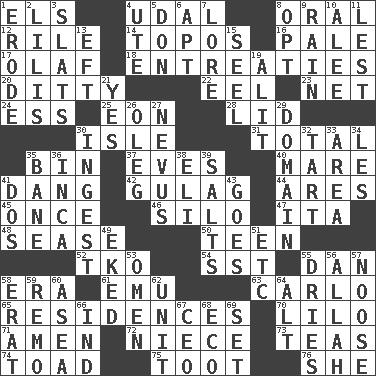 ACROSS 1. Raised railways 4. Allodial 8. Relating to the mouth 12. Cause heat under the collar 14. Traditional theme or motif 16. Light colored 17. Norwegian king 18. Pleas 20. Short, simple song 22. Snakelike fish 23. Fish or hair follower 24. Double-curved letter 25. A really long time 28. Hat (slang) 30. Small island 31. "_____ Recall" 35. Storage container 37. Nights before holidays 40. Female horse 41. Mild oath, euphamism for damn 42. Russian prison camp 44. Ancient Greek god of war 45. At one time in the past 46. Grain storage tower 47. Call ___ day 48. Gospel singer Marvin 50. Adolescent 52. Ring climax 54. Fast jet (abbr.) 55. Daniel's nick name 58. Epoch 61. Australian flightless bird 63. Monte _, Las Vegas Hotel/Casino 65. Homes 70. _ and Stitch 71. So be it 72. Sibling's daughter 73. Afternoon social gatherings 74. Frog relative 75. A blast of a horn 76. A female animal or person DOWN 1. Eat (away) 2. Ms. Damita and namesakes 3. Narrow boards 4. Shoshoni 5. Spanish title 6. Fitting 7. Old wives' tales, e.g. 8. Elect 9. Water falling in drops from the sky 10. Toward shelter 11. For fear that 13. Newt 15. Sew up the eyelids of hawks and falcons 19. Came down and settled, as after flight 21. Affirmative reply 26. Cassini of fashion 27. Congenital growth or mark on the skin 29. Realm 30. Swallow 32. Small pie 33. Type of rug 34. French article 35. Object of repulsion 36. South American Indian 38. Connecticut Ivy Leaguer 39. Table seasonings 41. Two (Sp.) 43. Leaves 49. Supplemented with great effort 51. And so on (abbr.) 53. Presage 55. Frees from moisture 56. Assad's deity 57. Trap for birds or small mammals 58. Part of Q.E.F. 59. San ____ (Riviera town) 60. Toward the sea 62. A single undivided whole 64. The first octave above the treble staff 66. Indiana (abbr.) 67. Corporate head (abbr.) 68. Environmental prefix 69. Put into a specified state
