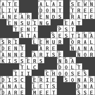 ACROSS 1. Had dinner 4. Mountain range southwest of Kyrgyzstan 8. Stitched 12. 54 in ancient Rome 13. Do not 14. Family _ (genealogy) 15. Approach 18. Extremities 19. Assign a rank or rating to 20. Taking place subsequently 22. Ingest 23. Portable shelter 24. Pacific Standard Time (abbr.) 25. "One Day ___ Time" 26. French poetic form 30. _ Lanka 33. Arboreal primate 36. Relating to the mouth 37. Scratch 39. "We ___ not amused" (Victoria) 40. Grandmother 41. Singer Murray 42. Get up 44. Or not 45. Smoochers 47. Basketball assoc. 50. Affectionate concern, for short 51. Dunce 53. One more than two 54. Elects 57. Plate 59. 4th largest of the Great Lakes 61. Underwater navigation system 63. Of or related to the anus 64. Allows 65. Heredity factor (abbr.) 66. Have the gumption 67. Confront 68. Compass dir. DOWN 1. Chicken ___ king 2. Prong on a fork 3. Incident 4. An important port of Yemen 5. Protracted 6. Added to 7. ___ a Wonderful Life 8. Ski resort town in Vermont 9. Part of Q.E.F. 10. Dripping 11. Born 16. At sea 17. The smallest animal of a litter 21. Slanted text style (abbr.) 22. Curvy letter 24. For each 26. Takes to court 27. SW Asia republic 28. Billionth: prefix 29. Having or resembling wings 30. Neighbor of Neb. 31. Painter Guido (1575-1642) 32. Taverns 34. Hearing organs 35. Medical imaging device (abbr.) 38. A testis 42. Curve 43. Inside; within (prefix) 46. Connecticut Ivy Leaguer 48. Expressions of contempt or scorn 49. In addition 52. Is inclined (to) 53. Austrian river, tributary to the Danube 54. Quote 55. Behest 56. Without 57. Male parent 58. _ tizzy (2 wds.) 59. Shade tree 60. To separate or throw off 62. Actress Charlotte