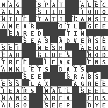 ACROSS 1. Tired old horse 4. Petty quarrel 8. Actor Baldwin 12. According to 13. Use a swizzle stick 14. "Corrida" creature 15. Mediterranean tributary 17. Jacques of French films 18. 2nd pers. sing. pres. of can (arch.) 19. Approach 21. Lubricate 23. Turn to the right 24. Having ears or earlike features 26. Shallow baking pan 28. Oceans 30. Contrary to your interests or welfare 34. Put into a specified state 37. Soft 39. A really long time 40. Hearing organ 41. Adhesives 43. Lower and raise head in agreement 44. Woody plant 46. Path through which fluid escapes 47. Followers of ems 48. Short socks 51. Raised platform 54. Perceive with the eye 55. Takes hold of 58. Double-curved letter 61. Not strict 63. Match 65. Separates forcefully 67. Promenade 71. Stitch closed the eyes of (a falcon) 72. Billionth: prefix 73. Type of rug 74. Begley and Asner 75. In addition 76. Ooze 77. Color DOWN 1. Nanny 2. Place in a line 3. An organ shaped like a helmet 4. Fast jet (abbr.) 5. Parent Teacher Association (abbr.) 6. Small island 7. Musical group of three 8. "One Day ___ Time" 9. Having great length 10. Celtic language 11. ____ d'Azur (French Riviera) 16. Hearing organs 18. 154 in Roman numerals 20. To sift 22. It would 25. Mild oath, euphamism for damn 27. Teachers' org. 29. Exchanges for money 30. Having the leading position 31. French philosopher Descartes 32. Within a short period 33. Conclusions 34. Stalk of a moss capsule 35. Merit 36. Long journey 38. Institute legal proceedings 42. Heroin 45. Raised railways 49. Snakelike fish 50. Afternoon social gathering 52. Lyricist Gershwin 53. Sinks 56. A special lineage 57. Full of seeds 58. Inactive volcano in Sicily 59. Lick closed 60. Without 62. Dec. holiday 64. Otherwise 66. Friend of Pooh 68. "We ___ not amused" (Victoria) 69. Area sheltered from the wind 70. Infant locale