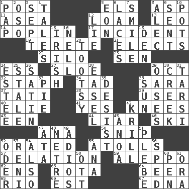 ACROSS 1. Mail 5. Raised railways 8. Cleo's killer 11. At sea 12. Rich soil 13. Lion 14. Cotton for raincoats, e.g. 17. Event 19. Cigar-shaped 21. Opts 22. Grain storage tower 23. Elected rep. 24. Double-curved letter 27. A type of plum 29. Sep. follower 32. Staphylococcus 34. Small boy 36. "Two Mules for Sister ____" 37. Jacques of French films 38. Compass dir. 39. One who uses or employs something 40. Writer Wiesel 41. It is so 42. Leg joints 43. Car or cant ending 44. One who doesn't tell the truth 46. What Jean-Claude Killy likes to do 47. Housemaid (var.) 50. Clip 52. Declaimed 55. Ringlike coral islands and reefs 57. Accusation by an informer 59. City in Syria 62. Followers of ems 63. Round or rotation of duties 64. Fermented drink made from hops 65. River (Sp.) 66. Eastern Standard Time (abbr.) 67. Pulitzer Prize-winning author Ferber DOWN 1. Infant food 2. Bear (Spanish) 3. Back-to-school mo. 4. Lies 5. A really long time 6. Shoestrings 7. Grin 8. Actor Baldwin 9. Transmitted 10. Cooking vessels 12. Untruth 15. From or relating to Ireland 16. 1994 drama film starring Jodie Foster 18. Lair 20. Tootsie (variant) 24. First name in cosmetics 25. Lacking originality or spontaneity 26. Smooth fabric 28. Artist's stand 29. Fertile tracts in a desert 30. Small stream 31. Tarsus (plural) 33. Sliced dessert 35. Cease 36. Player for Phoenix 42. The principal food of baleen whales 45. Small Philippine buffalo 47. _ moment's notice (2 wds.) 48. Distance measurement (Brit.) 49. Goodbye (Sp.) 51. Military trainee 52. River in Europe 53. Painter Guido (1575-1642) 54. In addition 55. Santa ___, CA 56. Moved rapidly 58. Baseball player Mel 60. Animal enclosure 61. Mouth or opening