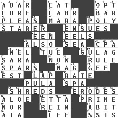 ACROSS 1. The sixth month of the Jewish calendar 5. Consume 8. Choose 11. Old wives' tales, e.g. 12. Cowardly lion portrayer 14. Drinking establishment 15. Entreaties 17. Hindu Mythology: god of death 18. More than one (prefix) 19. A viewer who gazes fixedly 21. Follows as a consequence or result 23. Car or cant ending 25. Snakelike fish 26. In addition 27. Ocean 28. Numbers guy (abbr.) 31. Cartoonist voice _ Blanc 33. Third day of the wk. 35. Russian prison camp 37. "Two Mules for Sister ____" 38. At this time 40. Court order 41. Practice fights 43. Tired old horse 45. Turn to the right 46. Eastern Standard Time (abbr.) 47. Pet locale 50. Pace 52. Monetary unit of Botswana 53. Health resort 54. Fragments 56. Eats (away) 61. _ vera 62. Singer James 65. A-one 66. Or not 67. It's straight from the horse's mouth 68. "This won't hurt ____!" 69. "One Day ___ Time" 70. Area sheltered from the wind 71. Fast planes DOWN 1. High mountains 2. Dunce 3. Length times width 4. Rump 5. Shade tree 6. American Automobile Association (abbr.) 7. Triplets 8. Mitch Miller's instrument 9. Friends 10. Attempt 13. Indian princess (variant) 16. Sew up the eyelids of hawks and falcons 18. Festering 20. State of inaction 22. Volcanic refuse 24. Part of speech 26. Having or resembling wings 28. A slight indication 29. Light colored 30. Grow older 31. Atlas contents 32. Part of Q.E.F. 34. Period of immesurable duration 36. Goad 37. Compass dir. 39. Armed conflicts 42. Turn sharply 44. Open wide 48. Tree or shrub in the Birch family 49. Soft color 51. Canvas cover 52. Before (prefix) 54. Narrow opening 55. Israeli folk dance 57. Mouths or openings 58. Claim 59. Give off 60. Puts into a specified state 61. Santa ___, CA 63. Neckwear 64. A saturated hydrocarbon