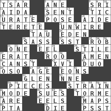 ACROSS 1. Russian ruler of old 5. A saturated hydrocarbon 8. Indian title of respect (Mr.) 11. Opera by Verdi 12. Emitted 14. Nervous spasm 15. A salt of uric acid 17. Airs 18. Helper 19. Cylindrical with tapered ends 21. Undo the wiring of 23. The 19th letter of the Greek alphabet 25. Locale of original sin 26. Backtalk 27. Fast jet (abbr.) 28. Director Reiner 31. Single 33. Snakelike fish 35. Vertical member of a panel or frame 37. Part of Q.E.F. 38. Friend of Pooh 40. So be it 41. 2nd pers. sing. pres. of can (arch.) 43. 16 45. Superhero pair 46. Bear (Spanish) 47. Grow older 50. Immeasurably long periods of time 52. Small, secluded valley 53. Compass dir. 54. Components 56. Put through a sieve 61. Method 62. Takes to court 65. Singer Mel 66. "We ___ not amused" (Victoria) 67. Snakelike fish 68. Atlas contents 69. Parent Teacher Assoc. 70. Pass on 71. Inconspicuous attention getter DOWN 1. Tense 2. The founder of a family 3. The sixth month of the Jewish calendar 4. Pace 5. Cleo's killer 6. Modern: prefix 7. Takes place subsequently 8. Agitate 9. Travel on an animal 10. Frozen water 13. Looks after 16. Singer James 18. The 18th letter of the Arabic alphabet 20. Relaxation 22. Moistens 24. One who makes use of a thing 26. Arranges properly for use 28. Tall New Zealand timber tree 29. Margarine 30. Benjamin's nick name 31. Mouths or openings 32. Billionth: prefix 34. Brine-cured salmon 36. Bits 37. Environmental prefix 39. Baking chamber 42. Baby powder 44. Charged particles 48. Honkers 49. Took place subsequently 51. Remaining after all deductions 52. Unit of force equal to gravity 54. Left side of a ship or aircraft 55. It may be bright or harebrained 57. Play 58. Ancient river in northeast Turkey 59. Naughty children 60. A home for chicks 61. Atlas unit 63. Biblical high priest 64. Compass dir.