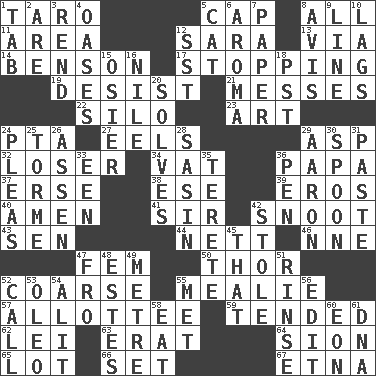 ACROSS 1. Edible starchy tuberous root 5. Head covering 8. Everything 11. Type of rug 12. "Two Mules for Sister ____" 13. By way of 14. Gillaume's butler role 17. Obstructing or blocking passage 19. Stop 21. Makes clutter 22. Grain storage tower 23. Tate display 24. Parent Teacher Assoc. 27. Snakelike fish 29. Cleo's killer 32. Failure 34. Large container 36. Dad 37. Celtic language 38. Compass dir. 39. Greek god of love 40. So be it 41. Title for a knight 42. Snob 43. Elected rep. 44. Remaining after all deductions 46. Compass dir. 47. Opposite of masc. 50. Son of Odin 52. Rough 55. Ear of corn 57. One to whom something is allotted 59. Looked after 62. Luau accessory 63. Part of Q.E.F. 64. The Jewish people; Israel 65. Car dealer's back yard 66. Put into a specified state 67. Inactive volcano in Sicily DOWN 1. Keyboard key 2. "We ___ not amused" (Victoria) 3. Tear apart 4. Fertile tracts in a desert 5. Feline 6. Scent 7. Some stationery 8. Advice 9. Actor's bit 10. Straggles 12. Fast jet (abbr.) 15. Flexible twig of a willow tree 16. Mediterranean tributary 18. Pacific Standard Time (abbr.) 20. Finds the solution 24. Entreaties 25. Singer Mel 26. NE Netherlands city 28. Indian antelope 29. Composer Copland 30. Soup utensil 31. Thick mixture 33. Car or cant ending 35. Cylindrical with tapered ends 36. Writing instrument 42. Took without asking 45. Not this but _ 47. Back 48. _____ Park, CO 49. Distance measurement (Brit.) 51. Wash lightly 52. Give a ring to 53. Margarine 54. Set down 55. Was introduced to 56. Prepare for publication 58. Ingest 60. A really long time 61. Heredity factor (abbr.)