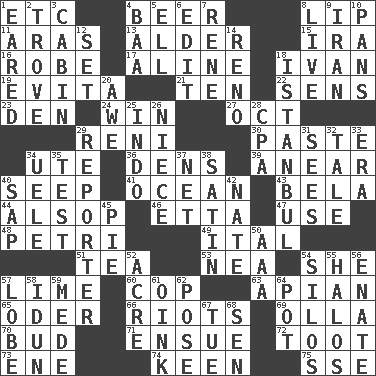 ACROSS 1. And so on (abbr.) 4. Fermented drink made from hops 8. Mouth edge 11. Caspian sea tributary 13. Tree or shrub in the Birch family 15. Retirement account (abbr.) 16. Loose flowing garment 17. Place in a line 18. _ the terrible 19. Webber/Rice musical 21. "___ Little Indians" 22. Elected reps. 23. Lair 24. Victory 27. Sep. follower 29. Painter Guido (1575-1642) 30. Thick mixture 34. Shoshoni 36. Cub Scout units 39. Approach 40. Ooze 41. Sea 43. Actor Lugosi 44. Columnist Joseph or Stewart 46. Singer James 47. Purpose 48. _ dish (used to culture cells) 49. Slanted text style (abbr.) 51. Beverage made from leaves 53. Teachers' org. 54. A female animal or person 57. Welles in "The Third Man" 60. Police officer (slang) 63. Bee-related 65. Baltic tributary 66. Debaucheries 69. Water jar 70. Partially opened flower 71. Take place subsequently 72. A blast of a horn 73. Compass dir. 74. Peachy ____! 75. Compass dir. DOWN 1. Having ears or earlike features 2. Collection of objects 3. Apartment or room in a ship 4. Sound made by sheep 5. Pipe bend 6. Prepare for publication 7. French philosopher Descartes 8. Moving, as bait 9. SW Asia republic 10. Zero-star reviews 12. Put into a specified state 14. Western Nevada city 18. Byzantium, centuries later 20. Deep reverence 25. Southeast Asian peninsula 26. Sibling's daughter 28. Tax preparer (abbr.) 29. Newsperson 31. Observes 32. Story 33. Epoch 34. Ubangi River tributary 35. Trial 37. Fish or hair follower 38. Smooth fabric 40. Plant excrement 42. Nathan's nickname 45. Sliced dessert 50. American Automobile Association (abbr.) 52. Measure of real estate 54. Grain storage towers 55. Auras 56. Maternal 57. Ear part 58. Goddess of spring and wife of Bragi 59. Ancient Persian 61. Pig sound 62. Introduce or present, as a question 64. Plant holder 67. Third day of the wk. 68. Elected rep.