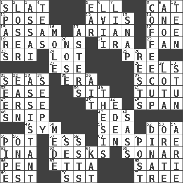ACROSS 1. Narrow board 5. Pipe bend 8. Domesticated feline 11. Airs 12. Deliberation 14. Single 15. Indian state 17. Believer in; advocate of (suffix) 18. Enemy 19. Thinks logically 21. Retirement account (abbr.) 22. Air blower 23. _ Lanka 24. Car dealer's back yard 25. Before (prefix) 27. Compass dir. 28. Snakelike fish 31. Oceans 35. Epoch 37. Highlander 38. Relaxation 39. Be seated 41. Ballerina skirt 42. Celtic language 43. Definite Article 45. Connect, as a bridge 46. Sever or remove by pinching or nipping 47. Begley and Asner 49. Symbol (abbr.) 51. Ocean 52. ___ good deed 55. Cooking vessel 57. Curvy letter 60. Motivate 62. _ tizzy (2 wds.) 63. Writing tables 65. Underwater navigation system 66. Fenced enclosure 67. Singer James 68. Suttee (variant) 69. Eastern Standard Time (abbr.) 70. Fast jet (abbr.) 71. Relationship diagram DOWN 1. Practice fights 2. Failure 3. Slender Brazilian palm 4. Afternoon social gatherings 5. Hearing organ 6. 57 in ancient Rome 7. One who doesn't tell the truth 8. Java holder (2 wds.) 9. Small Philippine buffalo 10. Adolescent 13. Fastener 16. Undercover agent 17. Michaelmas daisies 20. Sense of smell 26. Musical pauses 29. Globular water bottle used in Asia 30. Make senseless or dizzy 31. Observes 32. Merit 33. Aide 34. Oozy 36. Small island 40. College paper 44. Genesis locale 48. Backtalk 50. Ancient Persian 52. Middle Eastern gold or silver currency 53. Speak pompously 54. Nest on high 55. Corncob 56. Washington bills 58. Puts into a specified state 59. Fast planes 61. Mail 64. Krazy ___ of comics
