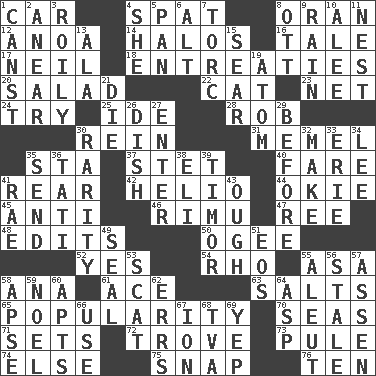 ACROSS 1. Automobile 4. Argument over a trivial matter 8. NW Algerian seaport 12. Small Philippine buffalo 14. Radiant circles of light 16. Lie 17. Famous astronaut Armstrong 18. Pleas 20. First course 22. Feline 23. Fish or hair follower 24. Attempt to accomplish something 25. Binary compound 28. Director Reiner 30. It's straight from the horse's mouth 31. Klaipeda city 35. R.R. building 37. Proofreading order 40. Conductor's collection 41. Stern 42. Sun: prefix 44. Migrant worker of the '30s 45. Against 46. Tall New Zealand timber tree 47. To riddle 48. Prepares for publication 50. Double curve, resembling the letter S 52. Affirmative reply 54. 17th letter of the Greek alphabet 55. White ___ sheet 58. Santa ___, CA 61. Adept person 63. Table seasonings 65. Teen's desire 70. Oceans 71. Arranges properly for use 72. Collection of objects 73. Whine 74. Otherwise 75. Fastener 76. "___ Little Indians" DOWN 1. 2nd pers. sing. pres. of can (arch.) 2. Approach 3. Turbulent 4. A female animal or person 5. Baking dish 6. Keyboard modifier key 7. Torque (variant) 8. Baseball player Mel 9. Water falling in drops from the sky 10. Toward shelter 11. Egg locale 13. Chicken ___ king 15. Shrivel 19. Smallest unit of an element 21. Expire 26. Food container 27. Keyboard key 29. Prior to 30. Noteworthy scarcity 32. Create 33. 4th largest of the Great Lakes 34. Area sheltered from the wind 35. Transmit 36. Jacques of French films 38. Biblical high priest 39. The easternmost of the Lesser Sundas 41. Actress Charlotte 43. Ending for "Through" and "Enough" 49. Lick closed 51. Greek goddess of the dawn 53. Jazz singing style 55. Eskimo relative 56. Having lost freshness 57. NE Netherlands city 58. Domed church section 59. Christmas carol 60. Tenement units (abbr.) 62. Blunders 64. Viper 66. Purpose 67. Electrically charged atom 68. Federal power corp. 69. Slangy assent