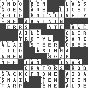 ACROSS 1. Southwest Nigerian state 5. Benjamin's nick name 8. Straggles 12. Moves 13. "We ___ not amused" (Victoria) 14. It is permitted: Lat. 15. Printing process, for short 16. Producing rotation 19. Compass dir. 20. Choose not to consume 21. Blunders 23. Had dinner 24. Deep reverence 27. Helper 30. River in Europe 31. TNT 34. Indian skirt 35. Jai ____ 38. Navigate 40. Algonquian 41. _ and Stitch 42. Respiratory problem 44. So be it 45. Fly high 46. Born 47. Scottish cap 50. Russian ruler of old 53. Speakers 57. Director Reiner 59. Italian handbag shop? 63. Opera by Verdi 64. Slow-paced one 65. "___ Little Indians" 66. Adolescent 67. Canvas cover 68. Compass dir. 69. Medicinal plant DOWN 1. Legendary monster 2. Trap for birds or small mammals 3. Prevent from occurring 4. Bear (Spanish) 5. Sharp remark 6. Greek god of love 7. Remaining after all deductions 8. 54 in ancient Rome 9. Adept person 10. Set 11. Filthy place 14. Actor's bit 17. American Automobile Association (abbr.) 18. Teat (slang) 20. SW Saudi Arabia district 22. Food allowance for one day 24. The sixth month of the Jewish calendar 25. Past tense of be (plural) 26. One of the Great Lakes 28. Two (Sp.) 29. Singer James 30. Motion picture awards 32. It is so 33. Allows 35. ____ Jay Lerner 36. Welles in "The Third Man" 37. Toward shelter 39. 17th letter of the Greek alphabet 43. Floor protectors 47. Utensil 48. Sandy's bark 49. Make imperfect 51. Satellite of Uranus 52. Cowboy competition 54. Haul 55. Sign of things to come 56. French philosopher Descartes 58. Object of repulsion 59. Fast jet (abbr.) 60. Santa ___, CA 61. Auto 62. Sleep 63. "One Day ___ Time"
