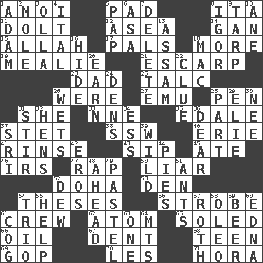 ACROSS 1. Mine, in Marseilles 5. Writing tablet 8. Call ___ day 11. Dunce 12. Toward the sea 14. Separate the seeds from cotton 15. Assad's deity 17. Friends 18. Greater amount 19. Ear of corn 21. Fortification 23. Male parent 25. Baby powder 26. Past tense of be (plural) 27. Australian flightless bird 28. Writing instrument 31. A female animal or person 33. Compass dir. 35. Peak District village in England 37. Proofreading order 38. Compass dir. 40. One of the Great Lakes 41. Remove soap 43. Small drink 45. Had dinner 46. Big collection agency 47. Strike 50. One who doesn't tell the truth 52. Capital of the state of Qatar 53. Lair 54. College papers 56. Disco prop 61. Ship's personnel 62. Tiny particle 65. Having a sole or soles 66. Petroleum 67. Scratch 68. Adolescent 69. Republican Party 70. French article 71. Israeli folk dance DOWN 1. First man 2. Undercover agent 3. Water jar 4. Slanted text style (abbr.) 5. Infant food 6. White ___ sheet 7. Erase 8. Composer Stravinsky 9. Canvas cover 10. A saturated hydrocarbon 13. Indian state 16. Flintstone garb 18. Apple computer (short form) 20. Merit 22. A slight indication 24. Hiding places for outlaws 26. Moistens 28. Component 29. Writer Wiesel 30. Born 31. Disorderly outburst 32. Coop moms 34. Curvy letter 36. Letter starter 37. _ Lanka 39. Rampant 42. Greek god of love 44. Sliced desserts 48. Having the leading position 49. Soft color 51. Pismires 52. Morning condensation 54. Musical group of three 55. Assist 57. Writer of Portnoy's Complaint (1969) 58. Butter sub 59. Fermented drink made from hops 60. Pulitzer Prize-winning author Ferber 61. Gear tooth 63. Single 64. Mountains (abbr.)