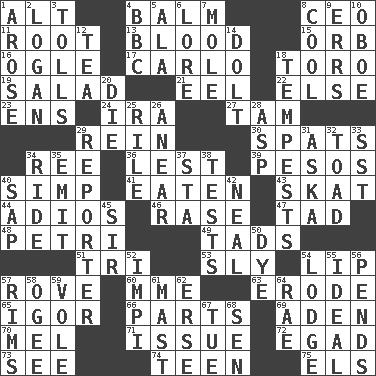 ACROSS 1. Keyboard modifier key 4. Lip ointment 8. Corporate head (abbr.) 11. Carrot, for example 13. Vital fluid 15. Globe 16. Stare at amorously 17. Monte _, Las Vegas Hotel/Casino 18. "Corrida" creature 19. Vegetable dish 21. Snakelike fish 22. Otherwise 23. Followers of ems 24. Retirement account (abbr.) 27. Scottish cap 29. It's straight from the horse's mouth 30. Arguments over trivial matters 34. To riddle 36. For fear that 39. Mexican monetary units 40. Simple or foolish person 41. Ingested 43. Three-handed card game 44. Goodbye (Sp.) 46. To erase 47. Bit 48. _ dish (used to culture cells) 49. Small amounts or degrees 51. Three (prefix) 53. Roguish 54. Mouth edge 57. Be footloose 60. Madame (abbr.) 63. Eat (away) 65. Composer Stravinsky 66. Actors' quests 69. Arabian gulf 70. Cartoonist voice _ Blanc 71. Come out of 72. Mild oath 73. Perceive with the eye 74. Adolescent 75. Raised railways DOWN 1. Came up 2. Utah city north of Ogden 3. For Whom the Bell _____ 4. English channel? 5. In the manner of 6. Old wives' tales, e.g. 7. Undercover agent 8. Calm and collected 9. Blunders 10. Mitch Miller's instrument 12. Afternoon social gathering 14. Stupid person 18. Storms 20. Pass on 25. Cause heat under the collar 26. Approach 28. Viper 29. News announcer 31. "____ silly question..." 32. Frog relative 33. Fast jet (abbr.) 34. Travel on or in a vehicle 35. Give off 37. R.R. building 38. Trials 40. Plant excrement 42. Be tempered by heat 45. Title for a knight 50. Color 52. Body of Kaffir warriors 54. Inn 55. Perfect 56. Hangs 57. Basketball hoops 58. Double curve, resembling the letter S 59. Short-tailed, large-bodied rat 61. Vertical spar for supporting sails 62. Celtic language 64. Actress Charlotte 67. Third day of the wk. 68. Elected rep.