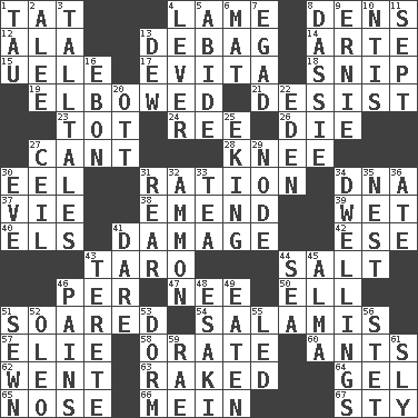 ACROSS 1. Make lace 4. Unable to walk 8. Habitations of wild animals 12. According to 13. Debunk (Brit. slang) 14. Johnson of "Laugh-In" 15. Ubangi River tributary 17. Webber/Rice musical 18. Sever or remove by pinching or nipping 19. Shoved, as through a crowd 21. Stop 23. Small child 24. To separate or throw off 26. Pass on 27. Patter 28. Leg joint 30. Snakelike fish 31. Food allowance for one day 34. Heredity factor (abbr.) 37. Compete 38. Make improvements or corrections to 39. Dripping 40. Raised railways 41. Break 42. Compass dir. 43. Edible starchy tuberous root 44. Table seasoning 46. For each 47. Born 50. Pipe bend 51. Flew 54. Deli grouping 57. Writer Wiesel 58. Declaim 60. Pismires 62. Gone 63. Swept the length of 64. Set 65. Sense of smell 66. Chow _ 67. Filthy place DOWN 1. The 19th letter of the Greek alphabet 2. Toward shelter 3. Baron Munchausen's specialties 4. Prying instrument 5. Stay 6. Floor protector 7. Mild oath 8. Hyrax 9. Bert's buddy 10. Nuclear Threat Initiatives 11. Back-to-school mo. 13. Morning condensation 16. Inky black, to poets 20. Baseball player Mel 22. Paradise 25. Supplementing with great effort 27. To provide with a ceiling 29. Connecting point 30. First lady 31. Tail end 32. ID or VA city 33. Afternoon social gathering 34. Residences 35. Egg locale 36. Had dinner 41. Have the gumption 43. Cylindrical with tapered ends 44. Ocean 45. _ mater 46. Aches 48. 1973 Nobel Price Winner (Physics) Leo 49. Consumed 51. Stitched 52. Margarine 53. Dormintory (informal) 55. Directed 56. Proofreading order 59. Actress Charlotte 61. Insidious