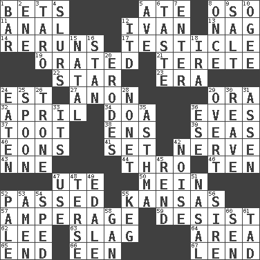 ACROSS 1. Antes 5. Had dinner 8. Bear (Spanish) 11. Of or related to the anus 12. "Terrible" tsar 13. Tired old horse 14. Summer TV shows 17. A testis 19. Spoke pompously 21. Cylindrical with tapered ends 22. Play the lead 23. Period 24. Eastern Standard Time (abbr.) 27. Soon (poet.) 29. Mouth or opening 32. Showery time 34. ___ good deed 36. Nights before holidays 37. A blast of a horn 38. Followers of ems 39. Oceans 40. Immeasurably long periods of time 41. Arrange properly for use 42. Impudent aggressiveness 43. Compass dir. 44. Through, poetically 46. "___ Little Indians" 47. Shoshoni 50. Count _ (2 wds.) 52. Went by 55. Sunflower state 57. Electrical Measurement 59. Stop 62. Area sheltered from the wind 63. Volcanic refuse 64. Length times width 65. Conclusion 66. Car or cant ending 67. Grant temporary use of DOWN 1. Long, evenly shaped piece 2. Compass dir. 3. Pacific island yam 4. Disparaging remarks 5. "___ Maria" 6. Clothes sense 7. Keyboard key 8. At one time in the past 9. Table seasoning 10. Double curve, resembling the letter S 12. It would 15. Brizilian seaport 16. Comedian Laurel of Laurel & Hardy 18. Retirement account (abbr.) 20. Eats (away) 24. Consumed 25. Soup utensil 26. Marketplace scale 28. Music written for nine 29. Unconcealed 30. Rob, plunder, or pillage 31. NE Netherlands city 33. ___ a Wonderful Life 35. Respiratory problem 36. Compass dir. 42. Annoying sound 45. Tear apart 47. Purpose 48. Laconic 49. Peak District village in England 51. Rhinal 52. Light colored 53. So be it 54. Moved rapidly 55. Barrel 56. Title for a man of rank and authority 58. Separate the seeds from cotton 60. Elected rep. 61. Bit