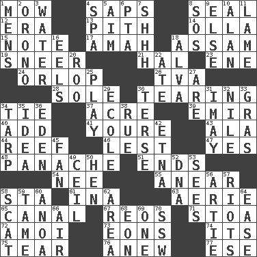 ACROSS 1. Cut the grass 4. Plant excrements 8. Lick closed 12. Epoch 13. Heart or essence 14. Rounded earthenware pot or jar 15. Musical sound 17. Nursemaid 18. Indian state 19. Contemptuous expression 21. Actor Linden 23. Compass dir. 24. Fourth or lowest deck 26. Federal power corp. 28. Flatfish 30. Separating forcefully 34. Neckwear 37. 1/640 square mile 39. Independent ruler or chieftain 40. Increase 41. You are 43. Wing 44. Coral collection 46. For fear that 47. It is so 48. Flamboyance 51. Conclusions 54. Born 55. Approach 58. R.R. building 61. _ tizzy (2 wds.) 63. Nest on high 65. Lessep's creation 67. Vintage cars 71. Portico 72. Mine, in Marseilles 73. Immeasurably long periods of time 74. ___ a Wonderful Life 75. Pull apart 76. Afresh 77. Compass dir. DOWN 1. Not women's 2. U. of Maine site 3. Wetness 4. Health resort 5. Direct toward a target or goal 6. Parent Teacher Assoc. 7. Quiet! 8. Mayday 9. Otherwise 10. Actor Alda or Thicke 11. Unable to walk 16. Snakelike fish 18. Inventor's middle name 20. Friend of Pooh 22. Had dinner 25. Frolic 27. "We ___ not amused" (Victoria) 29. Learning spot: Fr. 30. Laconic 31. "If ____ say so..." 32. The longest river in the world 33. Pate de foie ____ 34. Canvas cover 35. The content of cognition 36. Paradise 38. Regret 42. Inactive volcano in Sicily 45. Air blower 49. To provide with a ceiling 50. Layer 52. Heredity factor (abbr.) 53. Perceives with the eye 56. Nick name for Arthur 57. Disturbances 58. Jazz singing style 59. Not wild 60. Small Philippine buffalo 62. Type of rug 64. Comfort 66. Atmosphere 68. Period of immesurable duration 69. Single 70. Compass dir.