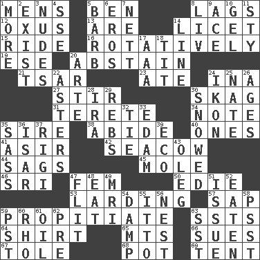 ACROSS 1. Not women's 5. Benjamin's nick name 8. Straggles 12. Amu Darya 13. "We ___ not amused" (Victoria) 14. It is permitted: Lat. 15. Travel on or in a vehicle 16. Happening in regular succession 19. Compass dir. 20. Choose not to consume 21. Russian ruler of old 23. Had dinner 24. _ tizzy (2 wds.) 27. Use a swizzle stick 30. Heroin 31. Cigar-shaped 34. Brief written record 35. Father 38. Stay 40. Washington bills 41. SW Saudi Arabia district 42. Manatee 44. Droops 45. Undercover agent 46. _ Lanka 47. Opposite of masc. 50. Singer Brickell 53. Preparing or cooking with lard 57. Plant excrement 59. Conciliate 63. Fast planes 64. Upper-body garment 65. Mountains (abbr.) 66. Takes to court 67. Lacquered or enameled metalware 68. Plant holder 69. Portable shelter DOWN 1. Greater amount 2. Be 3. Unclothed pictures 4. Compass dir. 5. Sharp remark 6. Greek god of love 7. Remaining after all deductions 8. 54 in ancient Rome 9. Adept person 10. Set 11. Filthy place 14. Actor's bit 17. Auto club (abbr.) 18. Teat (slang) 20. Johnson of "Laugh-In" 22. Michaelmas daisies 24. Picture 25. Nathan's nickname 26. Eras 28. Lyricist Gershwin 29. Confederate soldiers (slang) 30. Frozen precipiation fell 32. Neckwear 33. Dutch treat 35. Backtalk 36. Austrian river, tributary to the Danube 37. Swiss mountan, "Queen of the Mountains" 39. Environmental prefix 43. Cassini of fashion 47. Secret move to avoid paying debts 48. Erode 49. Medical imaging device (abbr.) 51. Come out of 52. Eroded 54. Moist 55. "Tell ____ the Marines!" 56. A home for chicks 58. Inconspicuous attention getter 59. Pacific Standard Time (abbr.) 60. 17th letter of the Greek alphabet 61. Petroleum 62. Before (prefix) 63. Fast jet (abbr.)