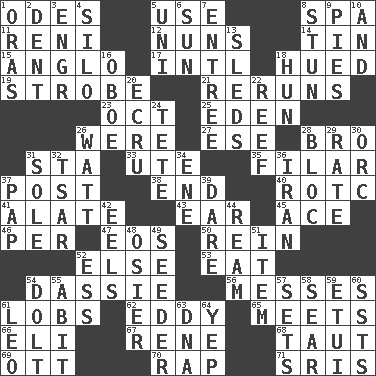ACROSS 1. Lyric poems 5. Purpose 8. Health resort 11. Painter Guido (1575-1642) 12. Religious women 14. Metal container 15. White American of non-Hispanic descent 17. International (abbr.) 18. Took on color 19. Disco prop 21. Summer TV shows 23. Sep. follower 25. Paradise 26. Past tense of be (plural) 27. Compass dir. 28. Sis' sibling 31. R.R. building 33. Shoshoni 35. Of or pertaining to a thread or threads 37. Mail 38. Conclusion 40. College mil. group 41. Having winglike extensions 43. Hearing organ 45. Adept person 46. For each 47. Greek goddess of the dawn 50. It's straight from the horse's mouth 52. Otherwise 53. Erode 54. Small ungulate mammals of Africa 56. Makes clutter 61. Tennis shots 62. Whirlpool 65. Confronts 66. Biblical high priest 67. French philosopher Descartes 68. Pulled tight 69. Baseball player Mel 70. Strike 71. Indian titles of respect DOWN 1. Mouths or openings 2. Gouge 3. Engineer (abbr.) 4. Grain storage tower 5. Single; one (prefix) 6. Player for Phoenix 7. Main course 8. Make senseless or dizzy 9. Sliced desserts 10. Added to 13. Bobsleighs 16. Mitch Miller's instrument 18. Attila the _ 20. Shade of tan 22. Coral ridge 24. Wig 26. Electrical Unit 28. Alliance 29. Pace 30. The grampus (Milton) 31. Not divided or shared with others 32. Russian ruler of old 34. Compass dir. 36. SW Asia republic 37. Infant food 39. Have the gumption 42. Snakelike fish 44. 480, 500 or 516 sheets of paper 48. Flexible twig of a willow tree 49. Sowing specialist 51. Detail 52. Double-curved letter 54. Stupid person 55. "This won't hurt ____!" 57. Arranges properly for use 58. Burn superficially 59. Needle holder 60. Fast planes 61. Lion 63. Heredity factor (abbr.) 64. Slangy assent