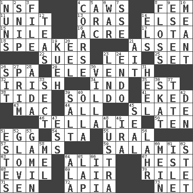ACROSS 1. Overdraft (abbr.) 4. Crow sounds 8. Opposite of masc. 11. A single undivided whole 13. Mouths or openings 14. Otherwise 15. Mediterranean tributary 16. Measure of real estate 17. Globular water bottle used in Asia 18. Orator 21. NE Netherlands city 22. Institutes legal proceedings 23. Luau accessory 25. Put into a specified state 26. Health resort 29. Veterans Day date 32. From or relating to Ireland 34. Working for oneself (abbr.) 35. Eastern Standard Time (abbr.) 38. Periodic rise and fall of the sea level 39. Twentieth part of a lira 41. Supplemented with great effort 43. Big _ 44. Everything 45. Schedule 46. Copy Pinocchio 50. "___ Little Indians" 51. Ovum 54. R.R. building 55. Mountain range 57. Criticizes harshly 59. Deli grouping 63. Heavy book 64. Came down and settled, as after flight 67. Behest 68. Morally bad or wrong 69. Den 70. Cause heat under the collar 71. Elected rep. 72. Capital of Western Samoa 73. Fish or hair follower DOWN 1. Religious women 2. Sever or remove by pinching or nipping 3. Do some clerical work 4. Unrefined 5. Curve 6. Armed conflict 7. Compass dir. 8. Soft thread for cleaning between teeth 9. First name in cosmetics 10. Intended 12. Beverages made from leaves 14. Raised railways 19. Malaysian steamed pastry 20. Snakelike fish 21. Small island 23. Grant temporary use of 24. Inside; within (prefix) 26. Be seated 27. Demure 28. Opera by Verdi 30. Country residence 31. The bottom of a shoe or boot 33. Religious group 36. Three-handed card game 37. False hair 39. Table seasoning 40. Water jar 42. Lair 45. Lick closed 47. Curvy letter 48. A period of five years 49. Retirement account (abbr.) 51. _____ Park, CO 52. Michael Jackson trademark 53. Homeless child 56. Cowardly lion portrayer 58. Cartoonist voice _ Blanc 60. Chow _ 61. Capri or Wight 62. Proofreading order 64. According to 65. Infant locale 66. One more than two