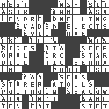 ACROSS 1. Behest 5. Overdraft (abbr.) 8. Be seated 11. SW Saudi Arabia district 12. Singer Murray 13. White ___ sheet 14. Poe poem 17. Residence 19. Dodged 21. Opts 22. Morally bad or wrong 23. Actress Charlotte 24. Make supply last 27. Snakelike fish 29. Mountains (abbr.) 32. Amusement-park features 34. Call ___ day 36. Ooze 37. Spoken 38. The grampus (Milton) 39. Play the lead 40. Deli pickle 41. Nervous spasm 42. Spanish missionary in California 43. Compass dir. 44. Sweet dark-red dessert wine 46. Eastern Standard Time (abbr.) 47. Auto club (abbr.) 50. Oceans 52. A viewer who gazes fixedly 55. Ringlike coral islands and reefs 57. Coward 59. Manatee 62. "One Day ___ Time" 63. Body of Kaffir warriors 64. Object of repulsion 65. Nine, plus one 66. Erode 67. Proofreading order DOWN 1. Actor Linden 2. Compass dir. 3. Trig term 4. Collection of objects 5. Compass dir. 6. Scornful expression 7. Chap (slang) 8. Ketch in the Levant 9. Is not 10. Labels 12. Say or write further 15. All-night dance parties 16. Singer Brickell 18. Area sheltered from the wind 20. American author Paul (1891-1958) 24. Eat (away) 25. Japanese brewing company 26. Peak District village in England 28. Remove all contents or possession from 29. Distance measurement (Brit.) 30. Rends 31. Small fatty European fish 33. Pipe bend 35. Buttonhole 36. Compass dir. 42. Lacking originality or spontaneity 45. Vintage cars 47. Tate display 48. Nest on high 49. Odor 51. Broad, flat, thick pieces 52. Petty quarrel 53. Haul 54. Actor Alda or Thicke 55. Black tropical American cuckoo 56. Go away! 58. Elect 60. Single 61. Soggy