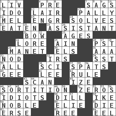 ACROSS 1. 54 in ancient Rome 4. Before (prefix) 7. Sinks 11. Wedding promise 12. Den 13. Friendly 14. Cartoonist voice _ Blanc 15. Engineer (abbr.) 16. Finds the solution 17. Eroded 19. Aide 21. Arrow shooter 23. Matures 24. Old wives' tales, e.g. 25. The 18th letter of the Arabic alphabet 26. Pacific Standard Time (abbr.) 29. French painter Edouard 30. Raised railways 31. American Automobile Association (abbr.) 32. Lower and raise head in agreement 33. Big collection agency 34. Fast jet (abbr.) 35. Everything 36. _-fi 37. Arguments over trivial matters 40. Unit of force equal to gravity 41. Area sheltered from the wind 42. Court order 43. Examine hastily 45. Ending with capital 46. Making a chance decision by using lots 51. Nothings 55. Foolish or stupid persons 56. Deli pickle 58. D.D.E's nickname 59. Impressive in appearance 60. Writer Wiesel 61. Expire 62. Celtic language 63. To separate or throw off 64. Snakelike fish DOWN 1. Welles in "The Third Man" 2. The main thing one is thinking about 3. Electrical Unit 4. Baking dish 5. Capital of Latvia 6. Blunders 7. Table seasonings 8. Inventor's middle name 9. Small, secluded valley 10. System (abbr.) 12. Poe poem 13. Airs 16. Public displays of written messages 18. Inky black, to poets 20. Moves on water 22. Dripping 24. Dipping utensil 25. Nest on high 26. Thick mixture 27. Backtalk 28. Make lace 29. Undercover agent 32. Tired old horse 33. Ancient Celtic tribe of eastern Britain 36. Narrow boards 37. Indian title of respect (Mr.) 38. What's this? 39. Toward shelter 43. Fur scarf 44. Quote 46. Trig term 47. Scent 48. Chest bones 49. Baltic tributary 50. "Death on the ____" 52. Travel on or in a vehicle 53. Migrant worker of the '30s 54. Stitch closed the eyes of (a falcon) 57. Untruth