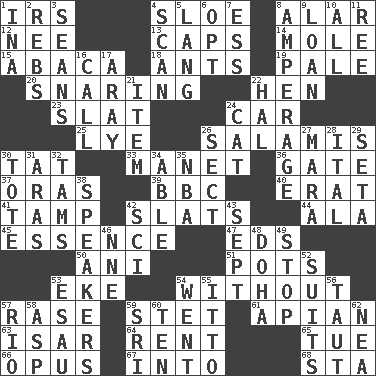 ACROSS 1. Big collection agency 4. _ gin 8. Having or resembling wings 12. Born 13. Balmoral and tarboosh 14. Undercover agent 15. Phillipine bananalike plant 18. Pismires 19. Diluted with white 20. Catching in a trap 22. Layer 23. Narrow board 24. Auto 25. Sodium hydroxide 26. Deli grouping 30. Make lace 33. French painter Edouard 36. Yard entry 37. Mouths or openings 39. English channel? 40. Part of Q.E.F. 41. Pack (down) 42. Narrow boards 44. Chicken ___ king 45. Center 47. Begley and Asner 50. Cuckoo 51. Plant holders 53. Supplement with great effort 54. Sans 57. Raze (variant) 59. Proofreading order 61. Bee-related 63. Austrian river, tributary to the Danube 64. Monthly bill 65. Third day of the wk. 66. Musical composition 67. To the inside or interior of 68. R.R. building DOWN 1. _ tizzy (2 wds.) 2. Confederate soldiers (slang) 3. Seines 4. Examine hastily 5. Austrian-born American filmmaker Fritz 6. Elect 7. Double-curved letter 8. Electrical Measurement 9. Grant temporary use of 10. Everything 11. To separate or throw off 16. Give a ring to 17. Like ___ of sunshine 21. A distinct part 22. Actor Linden 24. Feline 26. Religious group 27. Hindu Mythology: god of death 28. Slanted text style (abbr.) 29. Stalk of a moss capsule 30. Lug 31. Caspian sea tributary 32. Scottish caps 34. Competent 35. Basketball assoc. 38. Orators 42. _-fi 43. Back-to-school mo. 46. Compass dir. 48. Capital of the state of Qatar 49. Cease 52. Sets of matching outer garments 53. Son of Isaac 54. Gone 55. "Tell ____ the Marines!" 56. Strained 57. _ de Janeiro 58. Viper 59. Indian title of respect (Mr.) 60. Nine, plus one 62. Teachers' org.