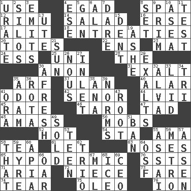 ACROSS 1. Purpose 4. Mild oath 8. Petty quarrel 12. Tall New Zealand timber tree 14. Vegetable dish 16. Celtic language 17. Set down 18. Pleas 20. Lugs 22. Followers of ems 23. Floor protector 24. Curvy letter 25. Corn or form start 28. Definite Article 30. Soon (poet.) 31. Honor 35. Sandy's bark 37. ____ Bator 40. Having or resembling wings 41. Aroma 42. Sir (Sp.) 44. 57 in ancient Rome 45. Assign a rank or rating to 46. Pacific island yam 47. Bit 48. Collect or gather 50. Disorderly crowds 52. Being at a high temperature 54. R.R. building 55. Housemaid (var.) 58. Beverage made from leaves 61. Allow 63. Olfactory organs 65. Under the skin 70. Fast planes 71. Operatic vocal solo 72. Sibling's daughter 73. Conductor's collection 74. Rend 75. Margarine 76. Electrically charged atom DOWN 1. A salt of uric acid 2. Grain storage towers 3. Sends forth 4. Compass dir. 5. Separate the seeds from cotton 6. The first octave above the treble staff 7. Have the gumption 8. Arrange properly for use 9. Demure 10. At sea 11. Trial 13. Shoshoni 15. Incision 19. American tennis player Robert 21. Player for Phoenix 26. Horse sense 27. An arm off of a larger body of water 29. Honors 30. Anew 32. Inventor's middle name 33. Put down 34. Three (prefix) 35. First man 36. Round or rotation of duties 38. Santa ___, CA 39. Typical standards 41. Mouth or opening 43. Carrot, for example 49. Exchanged or delivered for money 51. Bar 53. Adolescent 55. Slender Brazilian palm 56. Paris' subway 57. NE Netherlands city 58. Not this but _ 59. Jane of fiction 60. Capital of Western Samoa 62. Musical group of three 64. Order of Saint Francis (abbr.) 66. Rowing implement 67. Cartoonist voice _ Blanc 68. Frozen water 69. Corporate head (abbr.)