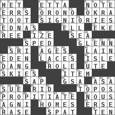 ACROSS 1. Was introduced to 4. Singer James 8. Musical sound 12. Blunders 14. U. of Maine site 16. Gumbo ingredient 17. A blast of a horn 18. Seigniories (variant) 20. Ferber et al. 22. Pipe bend 23. Supplement with great effort 24. Portuguese money of account (variant) 25. Ending with capital 28. Ocean 30. Drove too fast 31. American astronaut and politician John 35. Indian title of respect (Mr.) 37. Grows older 40. (Had) reclined 41. Paradise 42. Shoestrings 44. Capri or Wight 45. Mild oath, euphamism for damn 46. Hero or heavy, e.g. 47. Shoshoni 48. Atmospheres 50. Detail 52. Plant excrement 54. Girls' org. (abbr.) 55. White ___ sheet 58. Take to court 61. To free from 63. Literary convention 65. Appease 70. Common sense 71. Hindu god of fire 72. Residences 73. Celtic language 74. To erase 75. Argument over a trivial matter 76. "___ Little Indians" DOWN 1. Distance measurement 2. Eat (away) 3. Marketplace scale 4. Greek goddess of the dawn 5. Three (prefix) 6. Coat; cloak 7. Singer Murray 8. Not either 9. Migrant worker of the '30s 10. Long journey 11. Relaxation 13. R.R. building 15. Lubricates 19. Cassini of fashion 21. Small drink 26. Ardor 27. _ Allan Poe 29. Plant genus of onion and garlic 30. Scorches 32. Compass direction 33. Mediterranean tributary 34. Compass dir. 35. Neighbor of Neb. 36. Painter Guido (1575-1642) 38. Environmental prefix 39. Former Milwaukee Brewers owner Bud 41. Begley and Asner 43. Arranges properly for use 49. Indian skirt 51. Erode 53. Essential or central part 55. To the left, to Queeg 56. Boozer 57. NE Netherlands city 58. Practice fight 59. Capital and largest city of Mongolia 60. Immeasurably long periods of time 62. "Vaya con ____" 64. Single 66. Sliced dessert 67. Electrical Unit 68. Afternoon social gathering 69. Eastern Standard Time (abbr.)