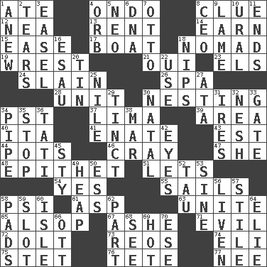 ACROSS 1. Had dinner 4. Southwest Nigerian state 8. A slight indication 12. Teachers' org. 13. Monthly bill 14. Merit 15. Comfort 17. Water vessel 18. Roamer 19. Take or capture by force 21. Fr. "Yes" 23. Raised railways 24. Killed 26. Health resort 28. A single undivided whole 30. Nestling 34. Pacific Standard Time (abbr.) 37. Pale green bean 39. Length times width 40. Call ___ day 41. Maternal 43. Eastern Standard Time (abbr.) 44. Cooking vessels 46. Supercomputer manufacturer 47. A female animal or person 48. Curse 51. Allows 54. Affirmative reply 55. Travel by water 58. Air pressure measure (abbr.) 61. Viper 63. Join together 65. Columnist Joseph or Stewart 67. American tennis player Robert 71. Morally bad or wrong 72. Dunce 73. Vintage cars 74. Biblical high priest 75. Proofreading order 76. False hair 77. Born DOWN 1. Afresh 2. Pulls into pieces 3. Artist's stand 4. Globe 5. Modern: prefix 6. Heredity factor (abbr.) 7. "Beetle Bailey" pooch 8. Corporate head (abbr.) 9. Unable to walk 10. Mountain range 11. Extremities 16. Son of Isaac 18. Pinches, bites 20. Metal container 22. Purpose 25. "Death on the ____" 27. _ moment's notice (2 wds.) 29. Tinged 30. Brizilian seaport 31. Angers 32. Tender 33. Yard entry 34. Corncob 35. Cease 36. Jacques of French films 38. Impair 42. Snake ____ (dice throw) 45. Filthy place 49. Pile 50. Double-curved letter 52. The 19th letter of the Greek alphabet 53. Trig term 56. Make or become more lively 57. Vertical member of a panel or frame 58. Writing tablets 59. Slit 60. Small island 62. Role in a play 64. Writer Wiesel 66. Baseball player Mel 68. Observe 69. Being at a high temperature 70. Compass dir.