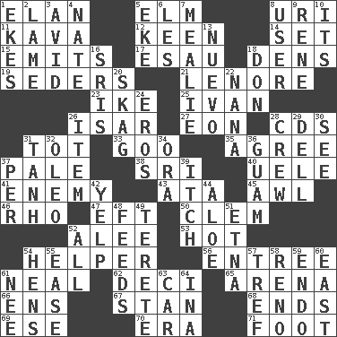 ACROSS 1. Flair 5. Shade tree 8. RI univ. 11. Polynesian shrub of the pepper family 12. Peachy ____! 14. Put into a specified state 15. Gives off 17. Son of Isaac 18. Habitations of wild animals 19. Spring feasts 21. Poe poem 23. Eisenhower's nickname 25. "Terrible" tsar 26. Austrian river, tributary to the Danube 27. Age 28. Music discs 31. Small child 33. Thick or sticky substance 35. Match 37. Diluted with white 38. Indian title of respect (Mr.) 40. Ubangi River tributary 41. Foe 43. "One Day ___ Time" 45. Leather borer 46. 17th letter of the Greek alphabet 47. Bank Draft (abbr.) 50. To starve (Brit.) 52. Toward shelter 53. Being at a high temperature 54. Assistant 56. Main course 61. Be tempered by heat 62. Tenth: prefix 65. Sports stadium 66. Followers of ems 67. Comedian Laurel of Laurel & Hardy 68. Extremities 69. Compass dir. 70. Epoch 71. 12 inches DOWN 1. Supplements with great effort 2. Unable to walk 3. Enthusiastic 4. Nathan's nickname 5. Supplement with great effort 6. French article 7. Ear of corn 8. One who uses or employs something 9. French philosopher Descartes 10. ___ a Wonderful Life 13. New (sp.) 16. Indian titles of respect 18. Spanish title 20. Heroin 22. Grandmother 24. Greek god of love 26. A whole individual unit 28. Group working together 29. Small valley 30. Observe 31. Hyperbolic tangent 32. Margarine 34. Mouth or opening 36. Island territory of the United States 37. For each 39. Hankering 42. Sharp bark 44. _ vera 48. Eats 49. Cylindrical with tapered ends 51. Inactive volcano in Sicily 52. Everything 54. Coop moms 55. Relaxation 57. Not kosher 58. Western Nevada city 59. Inside; within (prefix) 60. 90 degrees 61. Born 63. Automobile 64. _ tizzy (2 wds.)