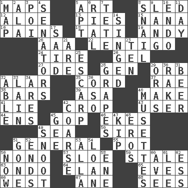 ACROSS 1. Atlas contents 5. Nonscientific branch of learning 8. Downhill vehicle 12. Medicinal plant 13. Sliced desserts 15. Nanny 16. Aches 18. Jacques of French films 19. Actor Griffith 20. American Automobile Association (abbr.) 22. Small, flat, pigmented spot on the skin 24. Hoop that covers a wheel 26. Set 27. Lyric poems 28. Commissioned mil. rank 29. Globe 32. Having or resembling wings 35. Drawstring 37. Actress Charlotte 38. Drinking establishments 39. White ___ sheet 40. Cause to be 41. Falsehood 42. Riding implement 43. One who uses or employs something 44. Followers of ems 45. Grand Old Party 46. Supplements with great effort 49. Ocean 50. Beget 51. Commissioned military rank 55. Plant holder 56. Words to Nanette 57. _ gin 59. Having lost freshness 63. Southwest Nigerian state 64. Enthusiasm 65. Nights before holidays 66. Compass direction 67. One (Scot) 68. Observes DOWN 1. Atlas unit 2. Wing 3. Luau course 4. Elected representatives 5. Fitting 6. Monetary unit of Yemen 7. Wig 8. Slow-paced one 9. Austrian-born American filmmaker Fritz 10. Inside; within (prefix) 11. 24 hours 14. Scorched 17. Expressed in words 21. "We ___ not amused" (Victoria) 23. Nine, plus one 25. Fortification 28. Raisin fruits 29. Mouths or openings 30. Immoral or dissolute person 31. Fermented drink made from hops 32. Competent 33. (Had) reclined 34. Ancient Greek god of war 36. Bear (Spanish) 40. French bagpipes 42. Rough 45. Turn to the right 47. Monetary unit of Laos 48. Greek god of love 49. Snob 51. Went 52. Conclusions 53. Silent film actress Nazimova 54. Grant temporary use of 56. At this time 58. Compass dir. 60. "___ Maria" 61. Area sheltered from the wind 62. Curvy letter