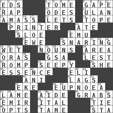 ACROSS 1. Begley and Asner 4. Heavy book 8. Yawn 12. Hit sharply and swiftly 13. Lyric poems 14. ____ Bator 15. Collect or gather 18. Allows 19. Drink excessively 20. Hard copy producer 22. Had dinner 23. A type of plum 24. Australian flightless bird 25. She-sheep 26. Catching in a trap 30. Dripping 33. Parts of speech 36. Length times width 37. Mouths or openings 39. Girls' org. (abbr.) 40. For fear that 41. Frolic 42. Oozy 44. A female animal or person 45. Center 47. Biblical high priest 50. Black tropical American cuckoo 51. Fails to keep up a pace 53. Make supply last 54. Normal relaxed breathing 57. Unable to walk 59. Helper 61. Takes hold of 63. Arab leader 64. Slanted text style (abbr.) 65. Make a knot 66. Chooses 67. Not wild 68. R.R. building DOWN 1. Period 2. Moist 3. Practice fights 4. Lacquered or enameled metalware 5. River in Europe 6. Was introduced to 7. Double-curved letter 8. From the throat 9. Medicinal plant 10. Infant food 11. Compass dir. 16. Filth; sediment 17. Overwhelm 21. Adolescent 22. Wet nurse (var.) 24. Followers of ems 26. Fastener 27. Angers 28. Soft 29. Yard entry 30. Had on 31. Greek god of love 32. Scottish caps 34. Double curve, resembling the letter S 35. Purpose 38. Orators 42. _-fi 43. Sharp bark 46. Compass dir. 48. Long (Scottish) 49. Russian composer Stravinsky 52. Theater features 53. Give off 54. Dutch treat 55. Ubangi River tributary 56. "This won't hurt ____!" 57. Lion 58. Electrical Unit 59. Small island 60. Call ___ day 62. Ocean