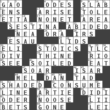 ACROSS 1. E Mali city 4. Lyric poems 8. Thick slice 12. Followers of ems 13. Originate 14. Lacquered or enameled metalware 15. Singer James 17. Music written for nine 18. Length times width 19. French poetic form 21. Tolerated 23. Teachers' org. 24. Mouth or opening 26. Big collection agency 27. He sold his birthright 28. Hats (slang) 30. Connecticut Ivy Leaguer 31. Unemotional ones 34. Affectionate concern, for short 37. HTML Container Element 38. One or ones belonging to thee 39. River (Sp.) 40. Observe 41. Dirtied 42. Consume 43. Fly high 44. Austrian river, tributary to the Danube 46. Cartoonist voice _ Blanc 47. One of the 12 tribes of Israel 50. Small amount or degree 51. Cast a shadow over 54. Ingest 57. Actor's bit 58. Nick name for Arthur 60. "You Light Up My Life" star Conn 62. River in Europe 63. Trap for birds or small mammals 64. Cards in a Roman deck? 65. Antes 66. Went 67. Flowery wreath DOWN 1. Unit of force equal to gravity 2. Pismires 3. Clearly or manifestly demonstrative 4. U. of Maine site 5. Middle Eastern gold or silver currency 6. Compass dir. 7. Bristle 8. Flight of steps 9. Nobles 10. Toward shelter 11. Necklace unit 13. Black tropical American cuckoo 16. At sea 20. The 19th letter of the Greek alphabet 22. Auction offers 25. Place in a line 27. Writer Wiesel 29. On the rocks 30. Begley and Asner 31. Portico 32. One of three equal parts 33. Lubricate 34. Excercise machine 35. One who doesn't tell the truth 36. Small bed 41. Flatfish 43. Spring feasts 44. ___ a Wonderful Life 45. Saudi Arabian king (1953-1964) 46. French painter Edouard 48. Gambison 49. Annoying sound 51. Oscar Madison type 52. Flintstone garb 53. Mild oath, euphamism for damn 55. Born 56. Singer Brickell 59. Friend of Pooh 61. One more than two