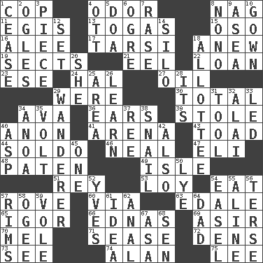 ACROSS 1. Police officer (slang) 4. Scent 8. Tired old horse 11. The front part of a cuirass 13. Ancient Roman robes 15. Bear (Spanish) 16. Toward shelter 17. Tarsus (plural) 18. Afresh 19. Religious groups 21. Snakelike fish 22. Grant temporary use of 23. Compass dir. 24. Actor Linden 27. Lubricate 29. We are 30. "_____ Recall" 34. Actress Gardner 36. Hearing organs 39. Took without asking 40. At once, immediately (arch.) 41. Sports stadium 43. Frog relative 44. Twentieth part of a lira 46. Actress Patricia 47. Biblical high priest 48. Eucharist need 49. Capri or Wight 51. Marina Del _, California 53. Myrna of the movies 54. Ingest 57. Be footloose 60. By way of 63. Peak District village in England 65. Composer Stravinsky 66. Ferber et al. 69. SW Saudi Arabia district 70. Cartoonist voice _ Blanc 71. Gospel singer Marvin 72. Habitations of wild animals 73. Perceive with the eye 74. Actor Alda or Thicke 75. Area sheltered from the wind DOWN 1. Desist 2. Stares at amorously 3. Component 4. Baseball player Mel 5. ___ good deed 6. Legendary monster 7. Raze (variant) 8. Words to Nanette 9. At sea 10. Long dress 12. Put into a specified state 14. Grain storage tower 18. One to whom something is allotted 20. A female animal or person 25. Length times width 26. Acquire or gain knowledge or skills 28. ___ a Wonderful Life 29. Roamer 31. Utensil 32. Jai ____ 33. Directed 34. Small Philippine buffalo 35. Electrical Unit 37. To separate or throw off 38. Slow-paced one 40. Viper 42. In addition 45. Single 50. Potassium hydroxide 52. Jacques Cousteau's middle name 54. Artist's stand 55. Place in a line 56. Laconic 57. Basketball hoops 58. Double curve, resembling the letter S 59. Grand slam 61. It may be bright or harebrained 62. Of or related to the anus 64. June honoree 67. White ___ sheet 68. Elected rep.