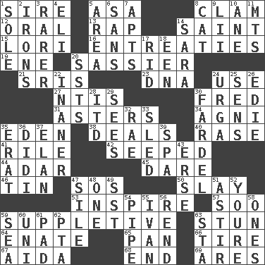 ACROSS 1. Beget 5. White ___ sheet 8. Dollar (slang) 12. Spoken 13. Reproach for some lapse or misdeed 14. Inhabitant of Heaven 15. Australian parrot (variant) 16. Pleas 19. Compass dir. 20. More impudent 21. Indian titles of respect 23. Heredity factor (abbr.) 24. Purpose 27. Nuclear Threat Initiatives 30. Flintstone 31. Michaelmas daisies 34. Hindu god of fire 35. Locale of original sin 38. Allots cards 40. Raze (variant) 41. Cause heat under the collar 42. Oozed 44. The sixth month of the Jewish calendar 45. Have the gumption 46. Metal container 47. Distress signal 50. Kill 53. Stimulate to action 57. "Barney Miller" actor Jack 59. Supplementary 63. Astound 64. Maternal 65. Baking dish 66. Become fatigued 67. Opera by Verdi 68. Conclude 69. Ancient Greek god of war DOWN 1. Flatfish 2. Metal shackles 3. Less widely known 4. Biblical high priest 5. Type of rug 6. Without 7. Flats, for short 8. Domesticated feline 9. Cards in a Roman deck? 10. One (Scot) 11. Mountains (abbr.) 14. "Two Mules for Sister ____" 17. To free from 18. Car or cant ending 20. Fast planes 22. Sillier 24. Capital and largest city of Mongolia 25. Elected reps. 26. Singer Brickell 28. It would 29. Perceives with the eye 30. Pack 32. Actress Charlotte 33. Downhill vehicle 35. Part of Q.E.F. 36. "You Light Up My Life" star Conn 37. Liveliness 39. Health resort 43. Celtic language 47. Drop; flow; fall 48. Single 49. Fast jet (abbr.) 51. Being in motion 52. You are 54. Corncob 55. _ the terrible 56. Tear apart 58. Washington bills 59. Ocean 60. University (slang) 61. Groovy apt. 62. Parent Teacher Association (abbr.) 63. R.R. building