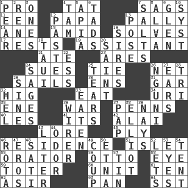 ACROSS 1. Adept person 4. Make lace 7. Sinks 11. Car or cant ending 12. Dad 13. Friendly 14. A saturated hydrocarbon 15. Among 16. Finds the solution 17. Musical pauses 19. Aide 21. Had dinner 23. Ancient Greek god of war 24. Institutes legal proceedings 25. Standoff 26. Fish or hair follower 29. Moves on water 30. Followers of ems 31. Slender fish 32. Russian fighter aircraft 33. Ingest 34. RI univ. 35. Compass dir. 36. Armed conflict 37. Actor Sean's family 40. French article 41. It is 42. Jai _ 43. Old wives' tales, e.g. 45. Apply oneself diligently 46. Home 51. Small island 55. Speaker 56. "Beetle Bailey" pooch 58. Sight organ 59. Carrier 60. A single undivided whole 61. "___ Little Indians" 62. SW Saudi Arabia district 63. Baking dish 64. Fast jet (abbr.) DOWN 1. Lightbulb-shaped fruit 2. French philosopher Descartes 3. Washington bills 4. Scottish cap 5. Capital of Western Samoa 6. Small boys 7. Table seasonings 8. Inventor's middle name 9. Small, secluded valley 10. System (abbr.) 12. Soft color 13. Airs 16. Begets 18. "Change" in Tahitian 20. Virtuous person 22. Curvy letter 24. Gurus 25. Rends 26. Group of southern Bantu languages 27. Hearing organs 28. Three (prefix) 29. Trig term 32. Cartoonist voice _ Blanc 33. Consumed 36. One who wires 37. Infant food 38. American author Paul (1891-1958) 39. Negative votes 43. 61 cubic inches 44. Aroma 46. Roll call or roster of names 47. Greek god of love 48. Suttee (variant) 49. Clever action or accomplishment 50. Inactive volcano in Sicily 52. Allows 53. Snake ____ (dice throw) 54. Portable shelter 57. Shallow baking pan